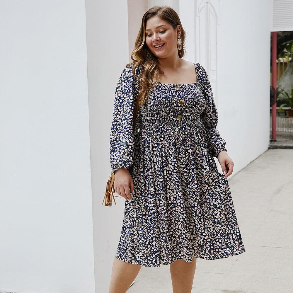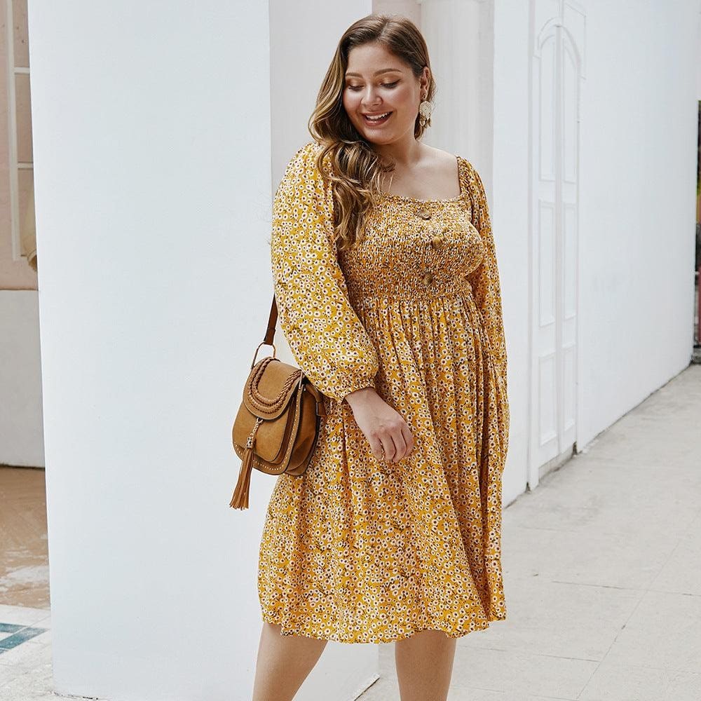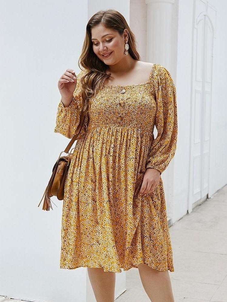Cette robe longue plus size décorée d’un minuscule tournesol mettra en avant vos formes avec classe. Son look bohème chic , ses couleurs vives et son motif floral ravissant ne laisseront personne insensible ! Son bustier smocké fermé par trois boutons sublimera votre silhouette avec élégance . Disponible en deux coloris : bleu ou jaune.