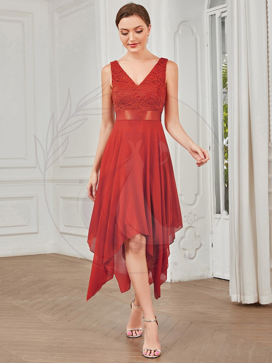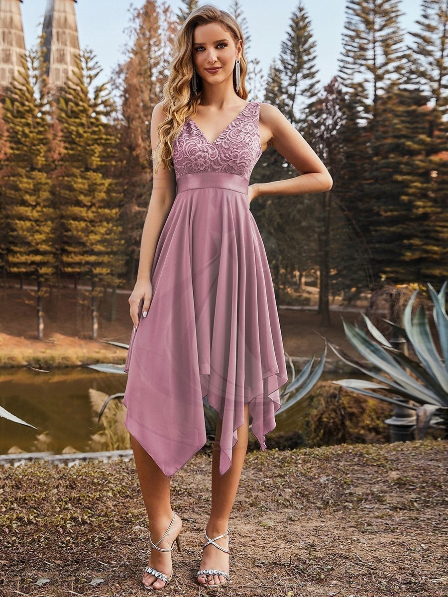 Attirez tous les regards lors d’un mariage avec cette éblouissante robe destinée aux invitées. Son design élégant, comprenant une coupe en A, un décolleté plongeant en V et une longueur au-dessus des genoux, vous mettra en valeur. Dotée d’un ourlet asymétrique attractif, cette tenue vous parera d’une allure féerique inégalable.