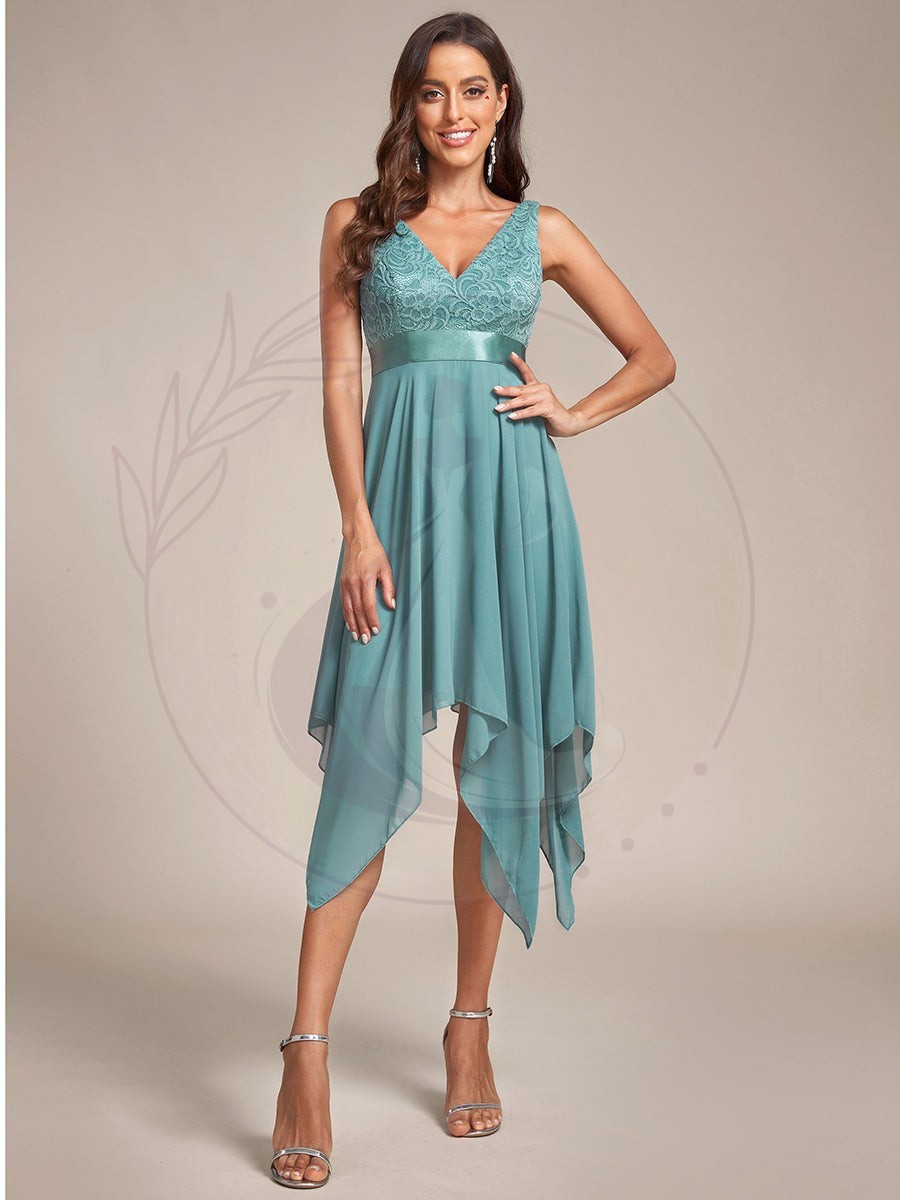 Robe mariage invitée en dentelle à col en V mi-longue fluide