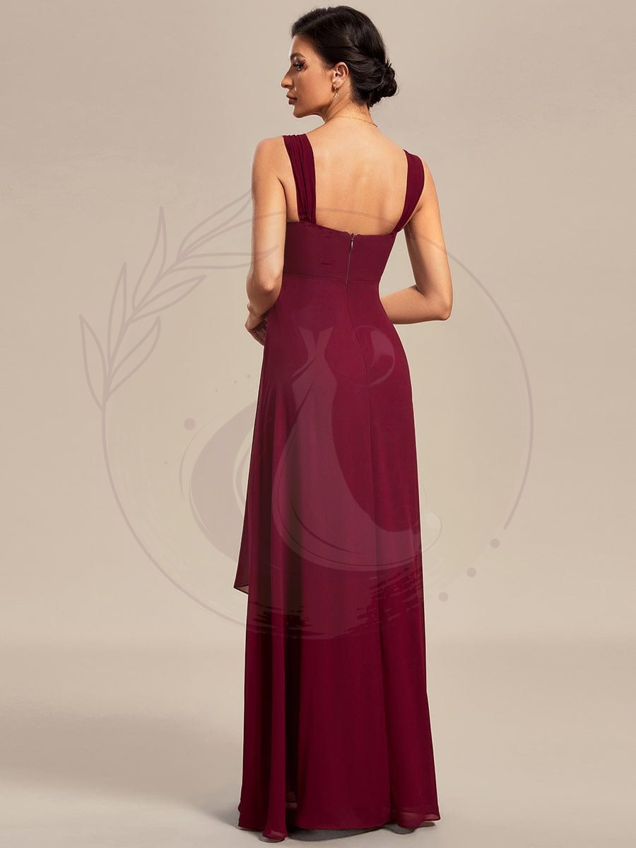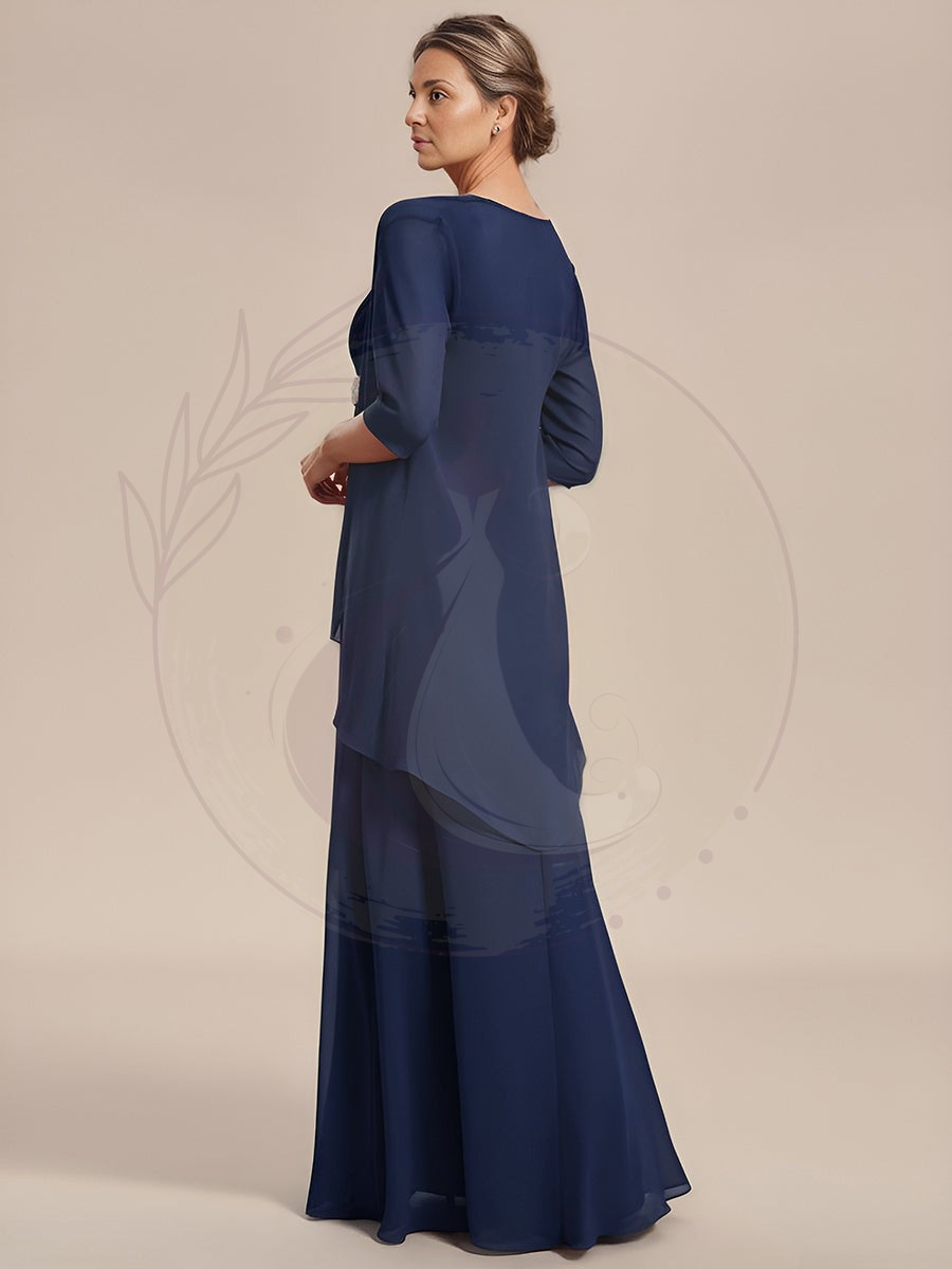 Découvrez cette élégante tenue deux pièces en forme de trapèze, idéale pour les mères des mariées qui aspirent à une allure raffinée et sophistiquée. Réalisée en mousseline, cette robe enveloppe gracieusement la silhouette, offrant un rendu léger et aérien qui saura mettre en valeur toutes les morphologies.