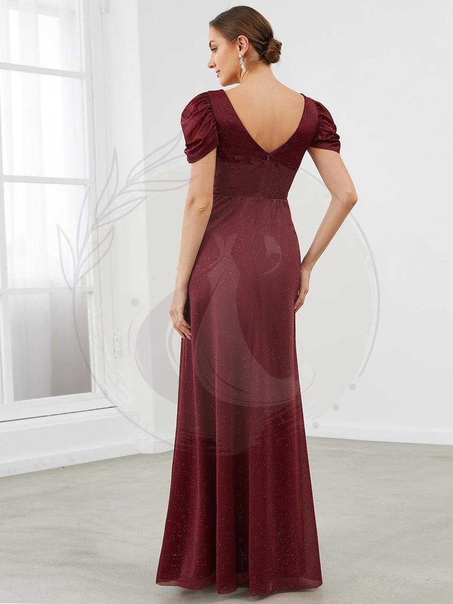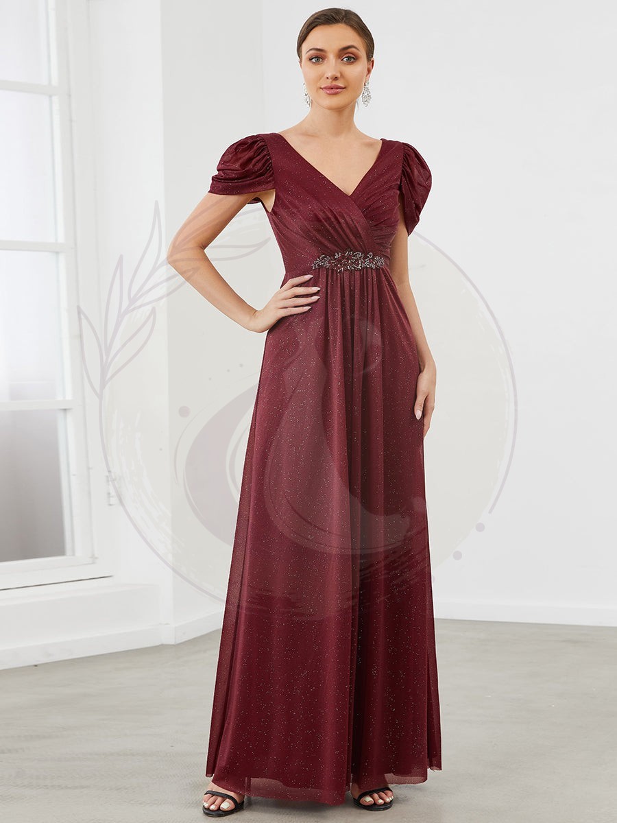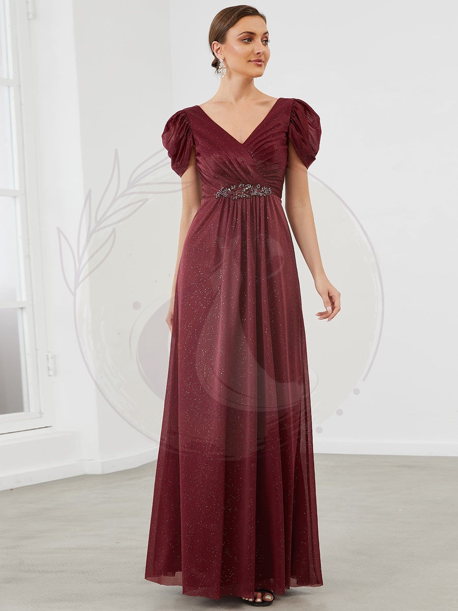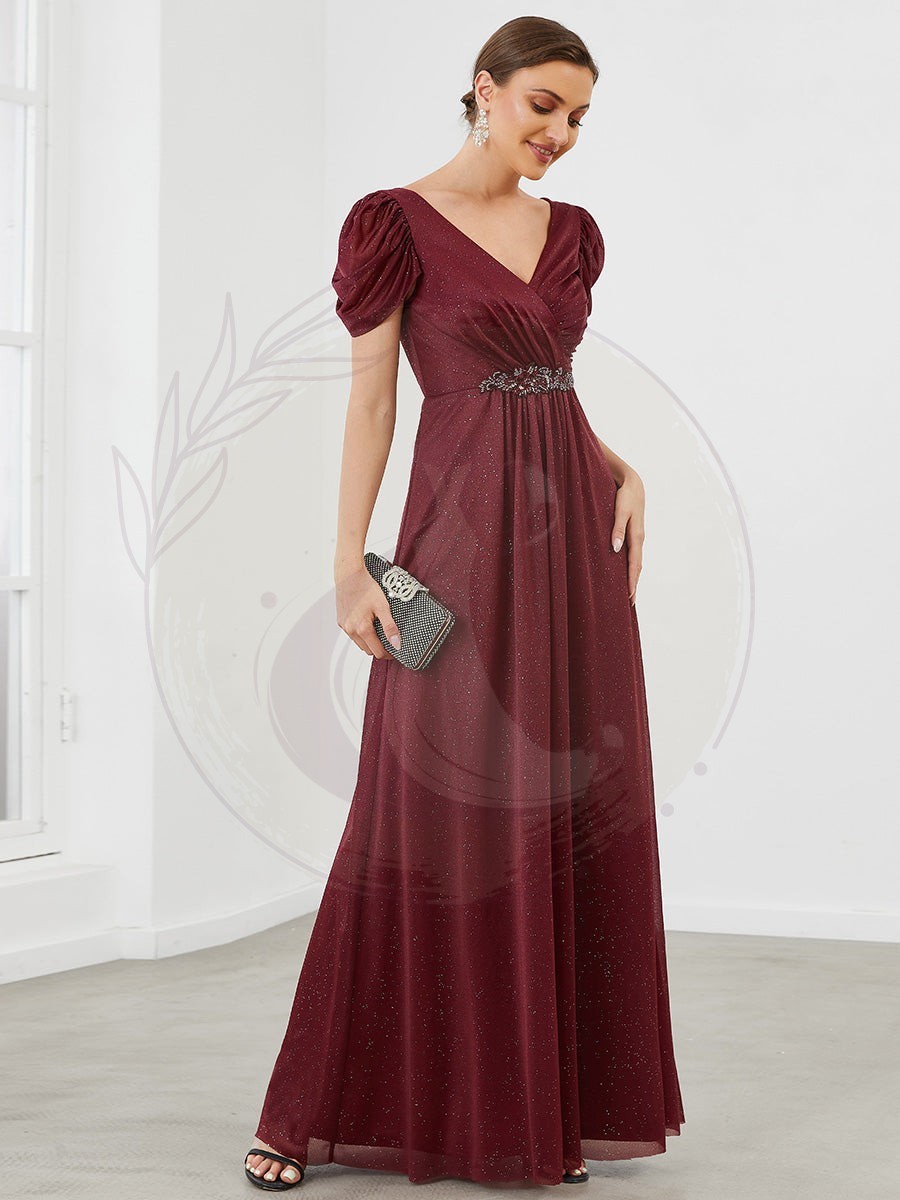 Robe mère de la mariée froncée à manches courtes avec appliques irisées