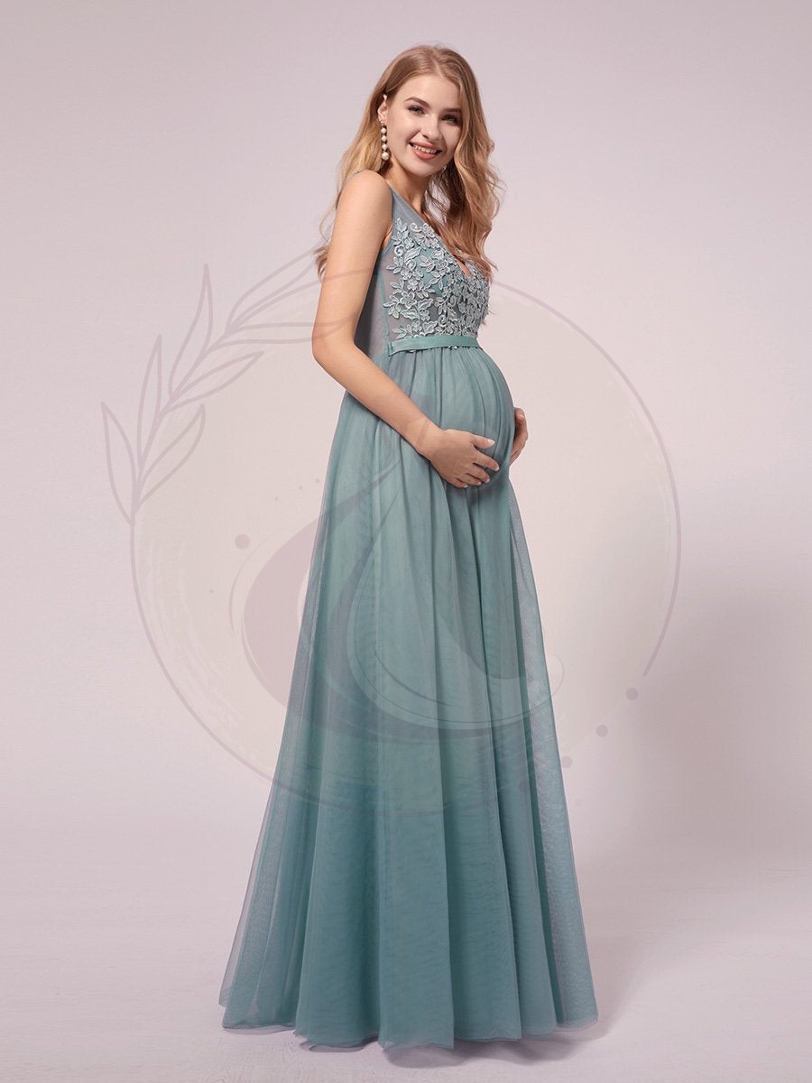 L’élégance est également de mise pendant la grossesse! Découvrez notre séduisante robe de demoiselle d’honneur spécialement conçue pour les futures mamans. Dotée d’un séduisant décolleté en V et d’un charmant design floral appliqué au niveau du buste, cette robe est le synonyme même de l’élégance pendant la maternité. Sans manches, elle bénéficie d’une coupe évasée qui mettra joliment en valeur vos nouvelles courbes. Attirez tous les regards lors de vos événements habillée de cette robe de maternité chic, source d’admiration et pourquoi pas, d’un brin d’envie.
