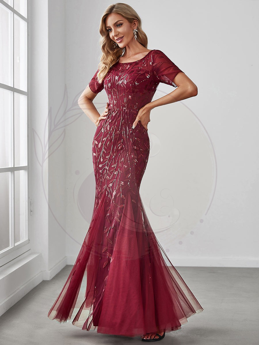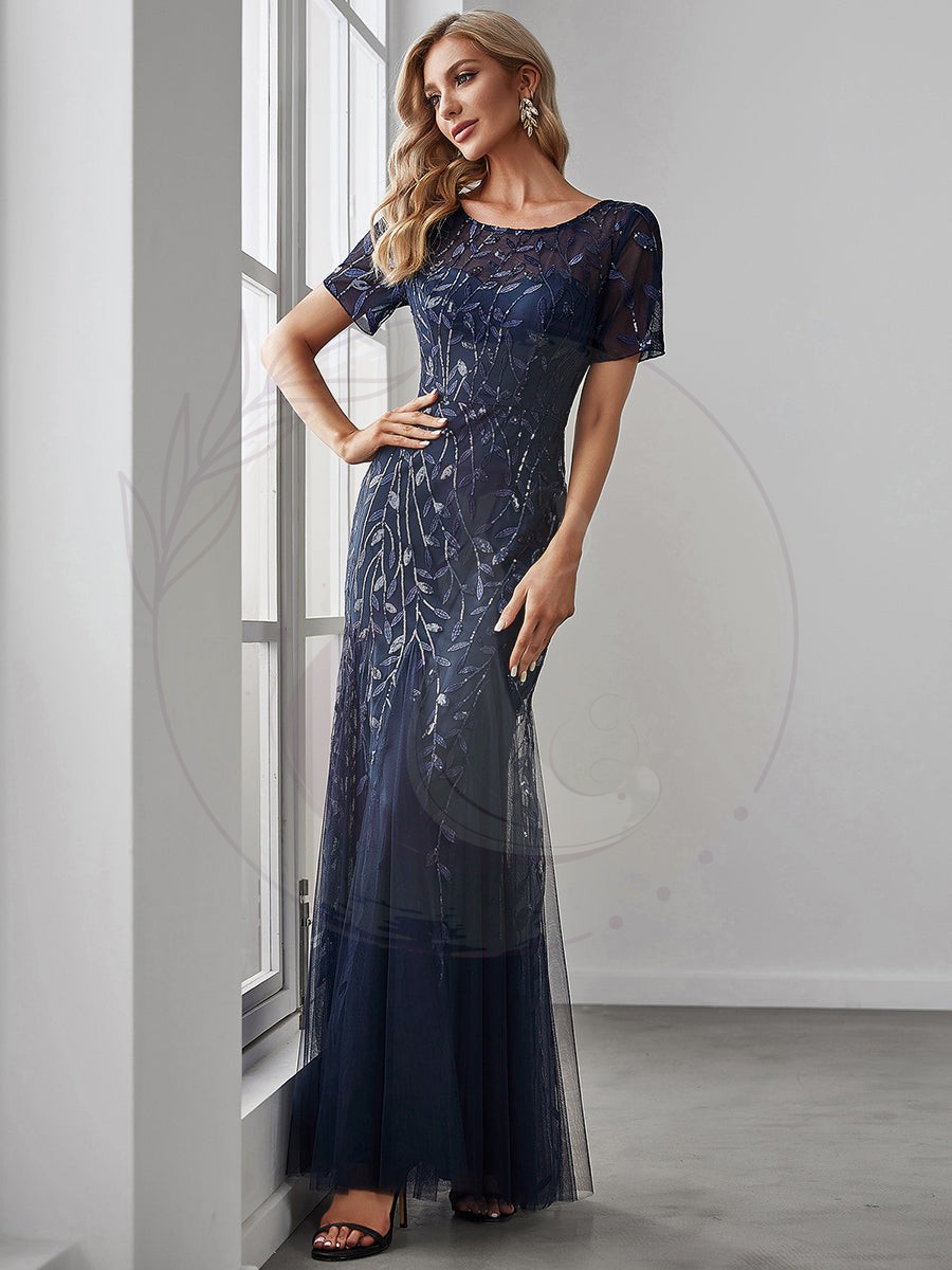 Revêtez-vous d’élégance avec cette robe de soirée scintillante en tulle, agrémentée d’un motif feuillage étincelant et d’une encolure ronde subtilement transparente. Idéale pour celles en quête d’allure sophistiquée, elle relève votre style d’une touche de raffinement qui sublimera votre sens de la mode.