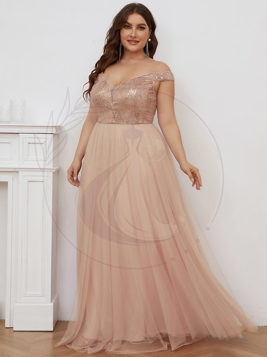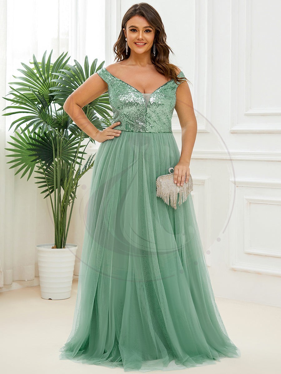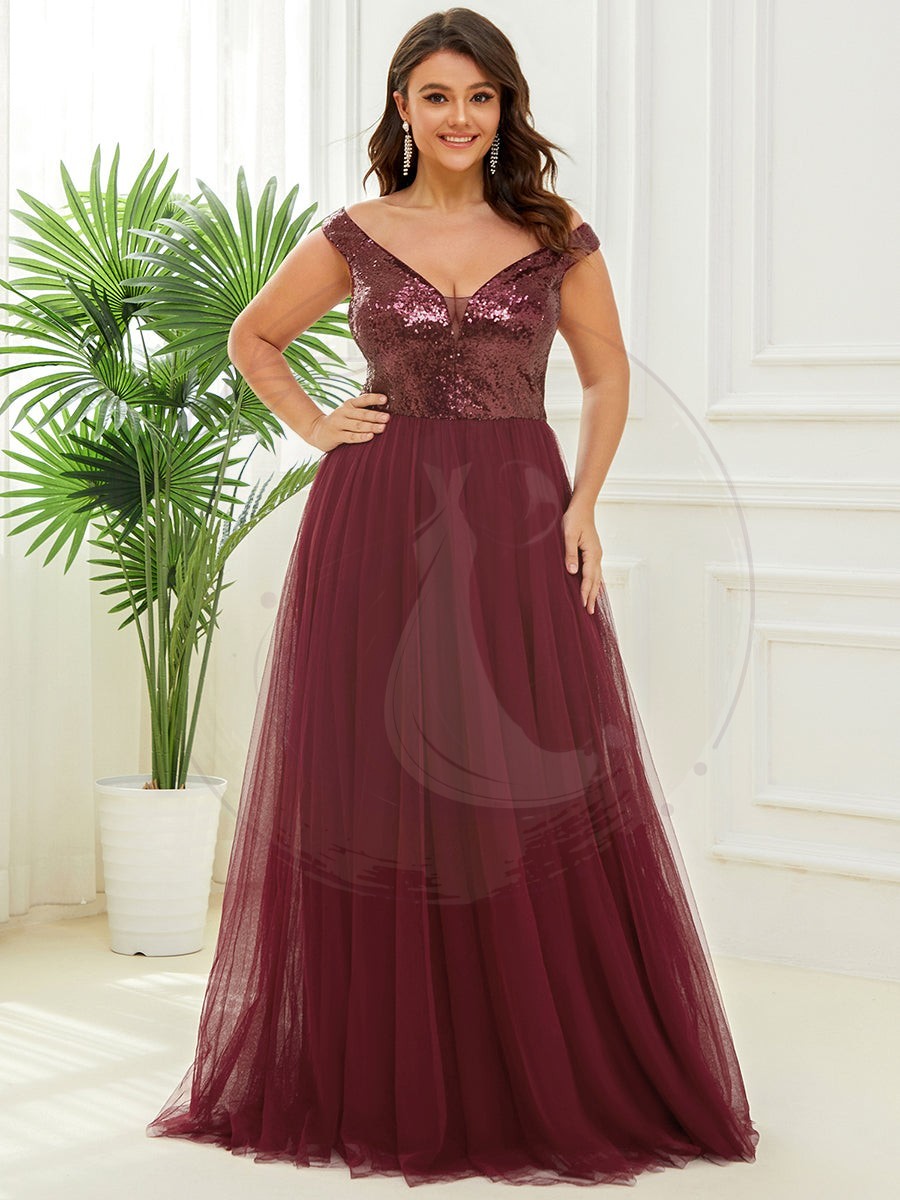 Éclipsez toutes les présences avec votre élégance en choisissant cette sublime robe de soirée grande taille. Une telle pièce d’habillement attire inévitablement le regard, et vous serez assaillie de compliments et de curiosité quant à l’origine de votre tenue spectaculaire. Cette robe se distingue par une coupe évasée élégante, un décolleté en V plongeant et des manches dévoilant subtilement les épaules pour une allure de reine de la nuit.