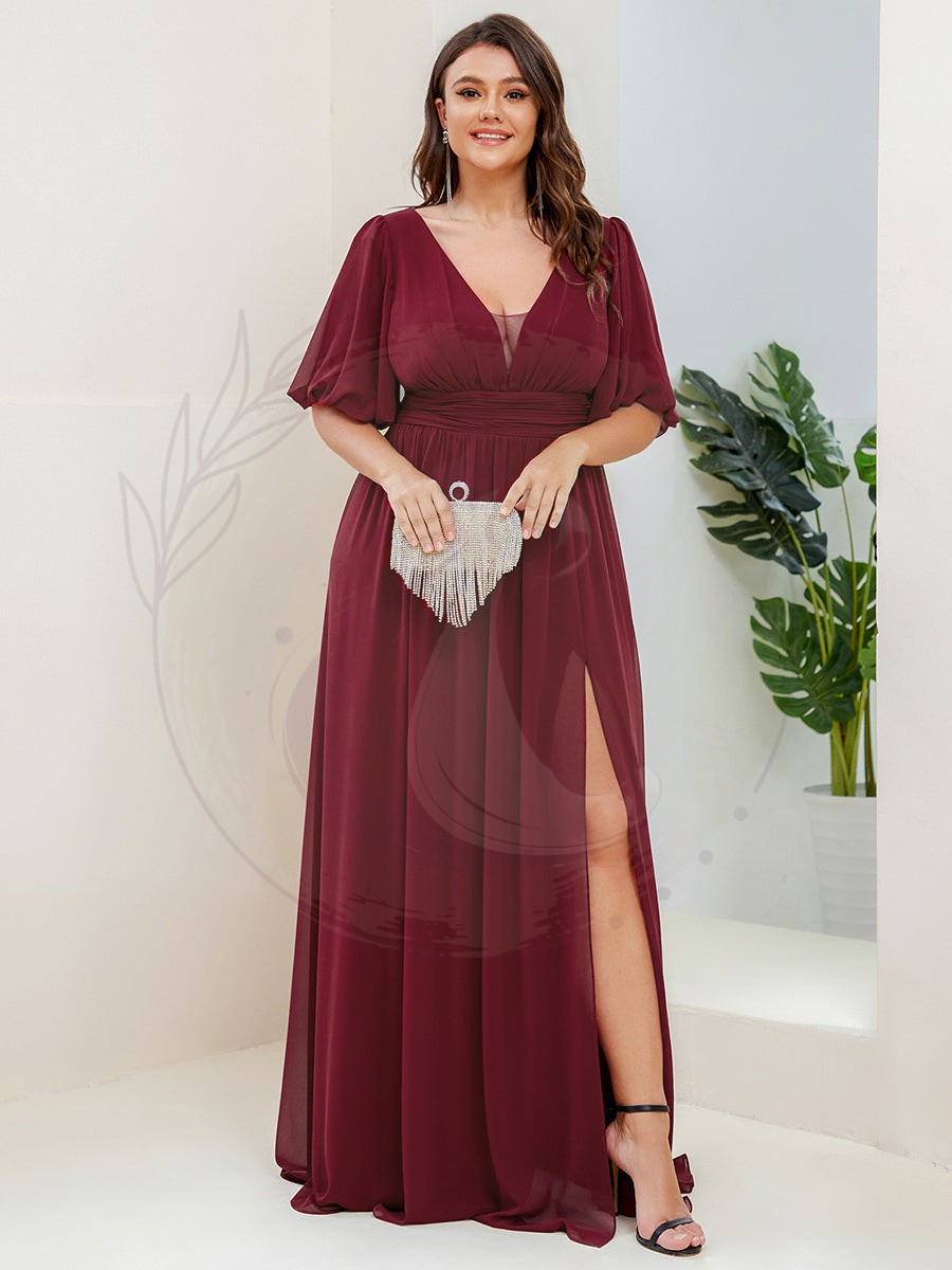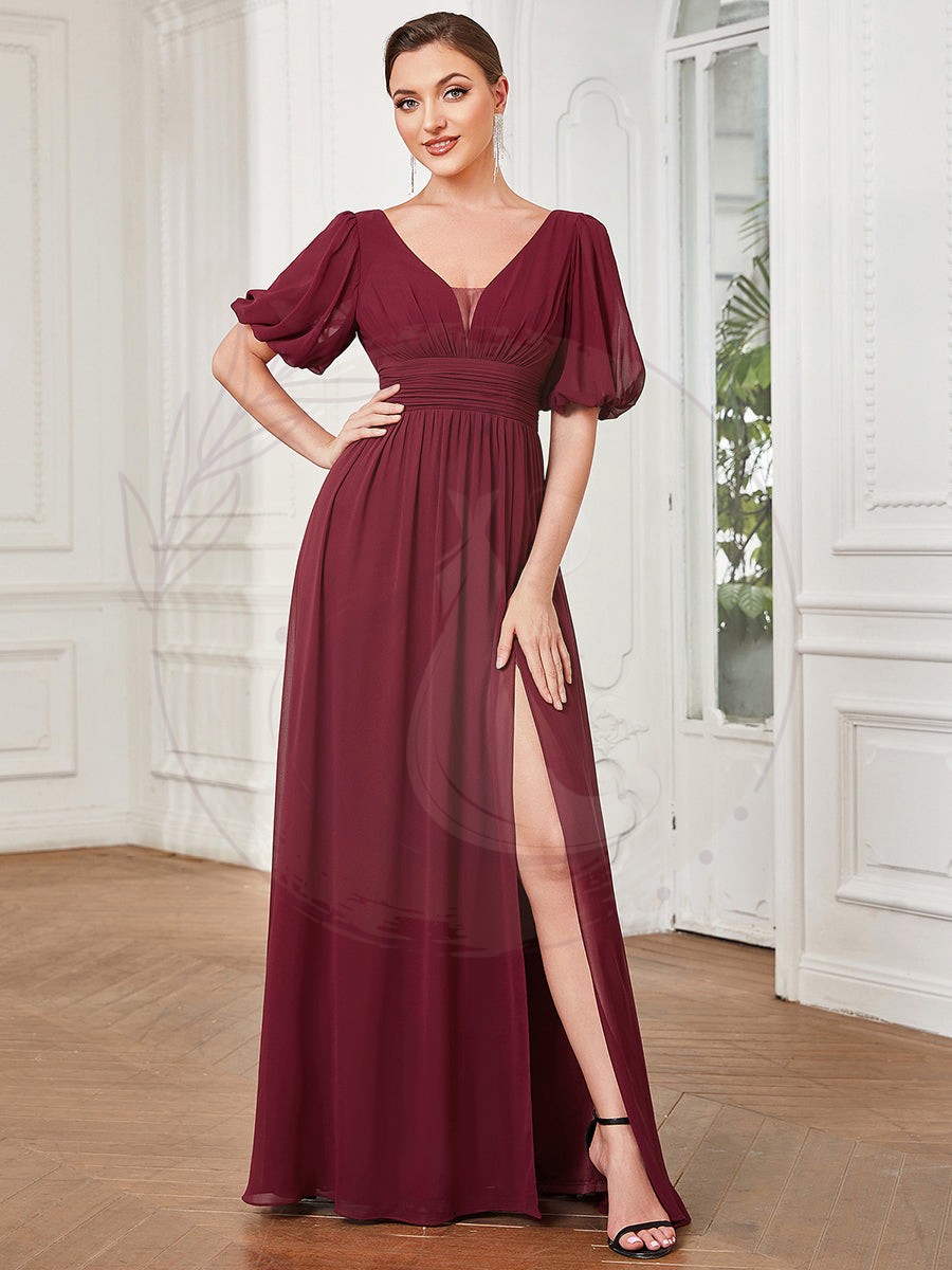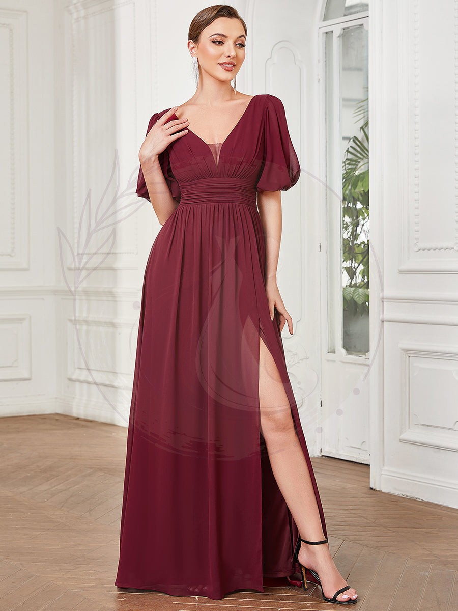 Optez pour l’élégance de cette robe de soirée fluide et longue, conçue pour sublimer vos grandes occasions, grâce à sa coupe spectaculaire munie d’une imposante fente latérale et d’une silhouette avantageusement marquée à la taille. Son décolleté en V vertigineux, agrémenté d’un voile d’illusion, ainsi qu’un gracieux dos en V viennent parfaitement finaliser les manches courtes volumineuses, en faisant une tenue idéale pour une réception, servant également de robe pour demoiselles d’honneur ou encore pour célébrer un mariage.