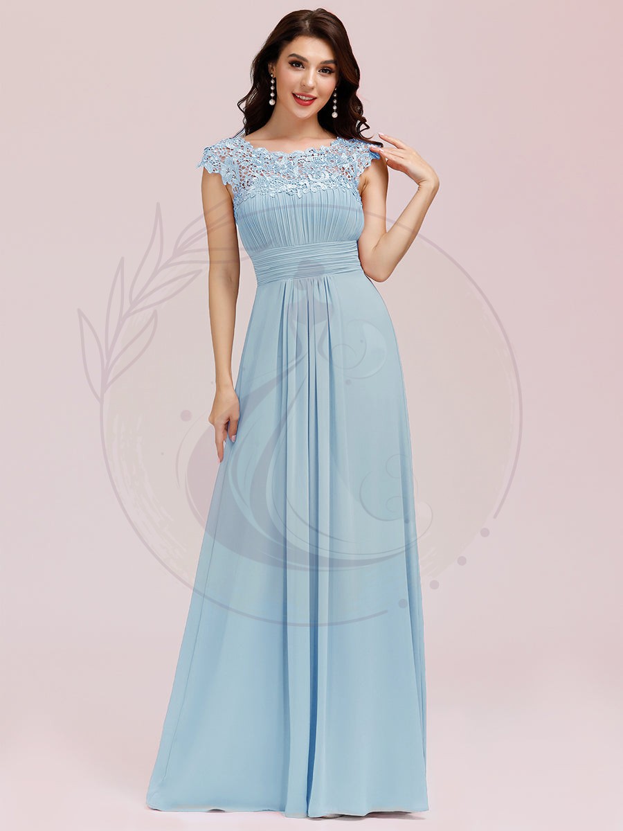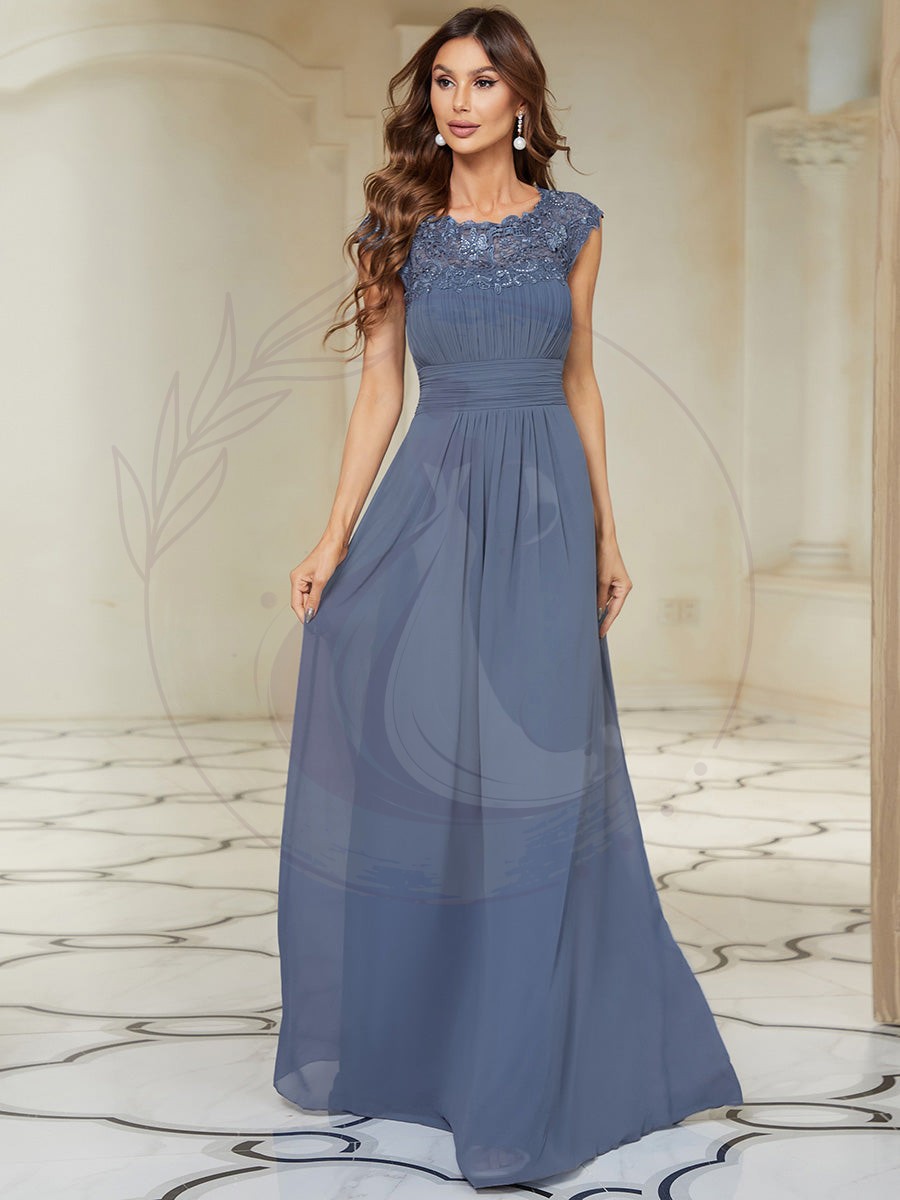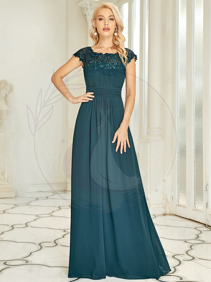 Explorez l’élégance intemporelle avec cette superbe robe de demoiselle d’honneur longue en fine mousseline. La robe se distingue par ses manches courtes en dentelle et son embellissement sophistiqué d’éléments strass sur l’encolure. Avec des plis soigneusement disposés au niveau du buste et de la taille, la robe sculpte une allure élégante et gracieuse, adaptée pour les cérémonies solennelles telles que les mariages.