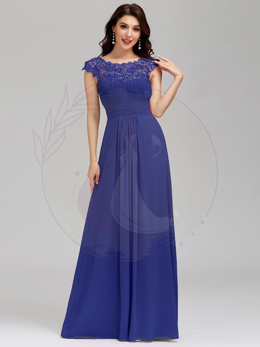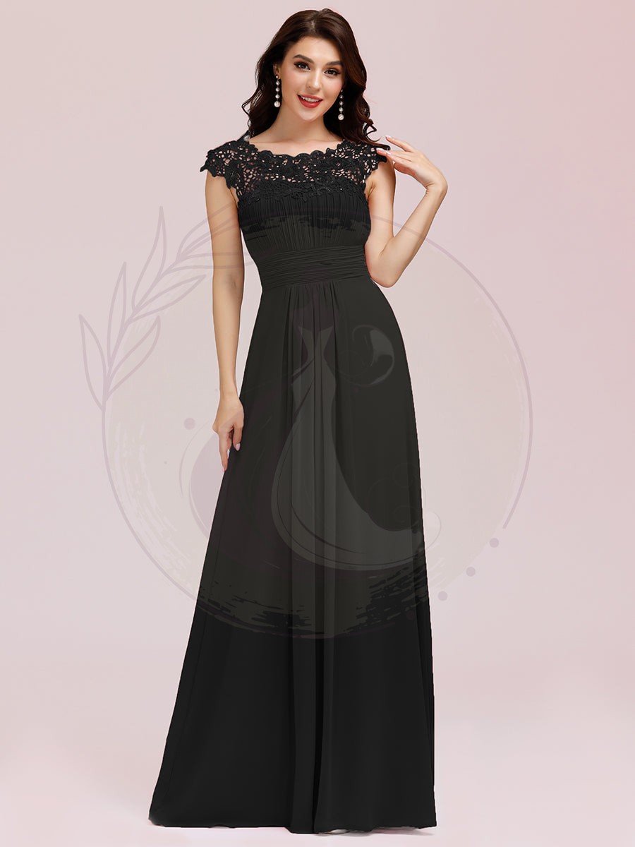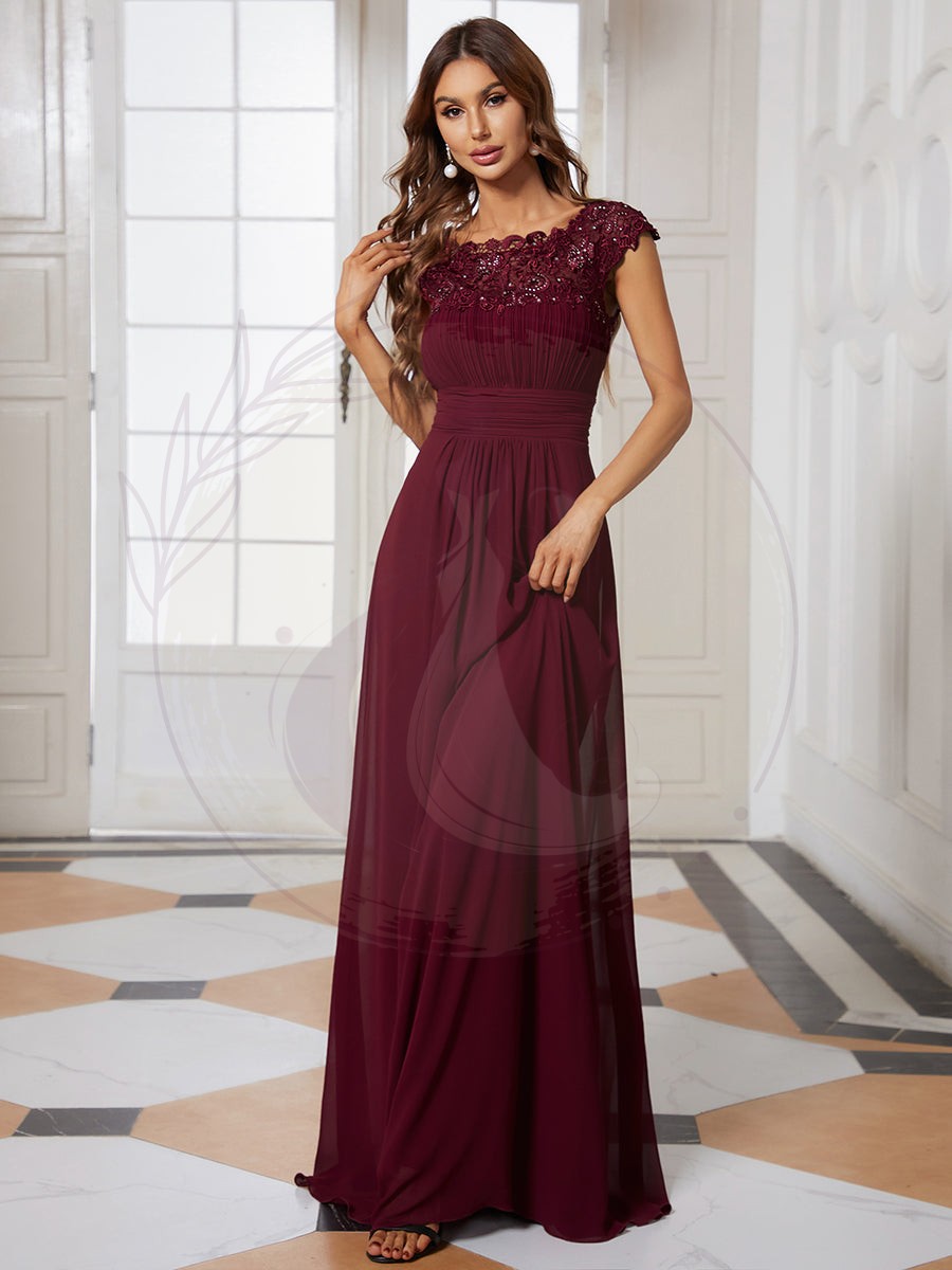 Explorez l’élégance intemporelle avec cette superbe robe de demoiselle d’honneur longue en fine mousseline. La robe se distingue par ses manches courtes en dentelle et son embellissement sophistiqué d’éléments strass sur l’encolure. Avec des plis soigneusement disposés au niveau du buste et de la taille, la robe sculpte une allure élégante et gracieuse, adaptée pour les cérémonies solennelles telles que les mariages.