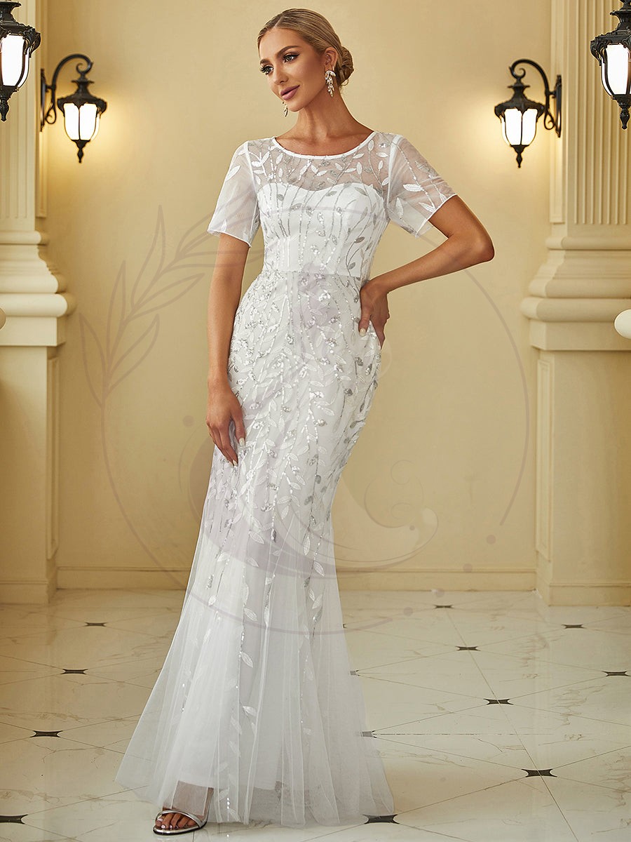 Découvrez cette sublime robe grande taille ornée de tulle pailleté et d’un motif feuillage lumineux qui incarne à merveille le romantisme. Avec son encolure ronde en transparence, elle offre une allure distinguée et chic. Les détails soignés de cette tenue reflètent votre sens des tendances et votre personnalité unique.