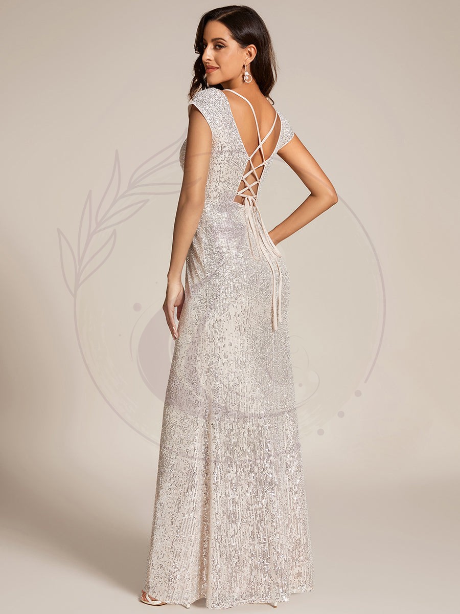 Taille personnalisée Sequin V-Neck High Slit Lace-Up Back Evening Dress