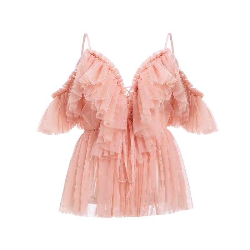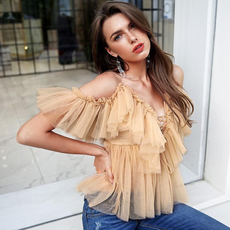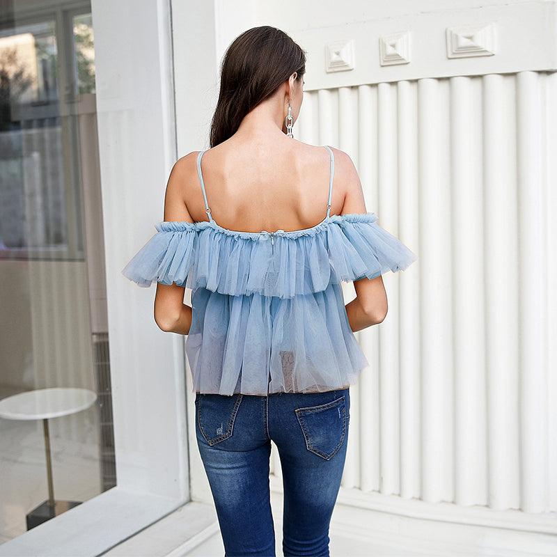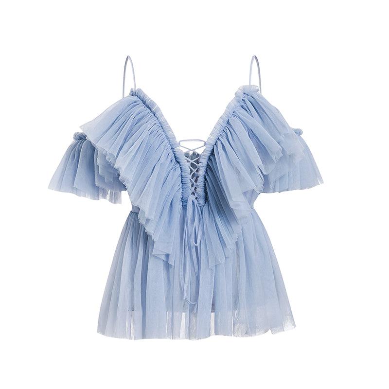 Ce délicat top en tulle voilage uni possède des bretelles fines et des manches courtes qui pendent sensuellement, laissant les épaules dénudées. Son laçage à l’avant donne une touche d’élégance et de séduction. Portez ce vêtement sexy pour être sublimée lors de vos soirées bohème pendant la saison estivale.