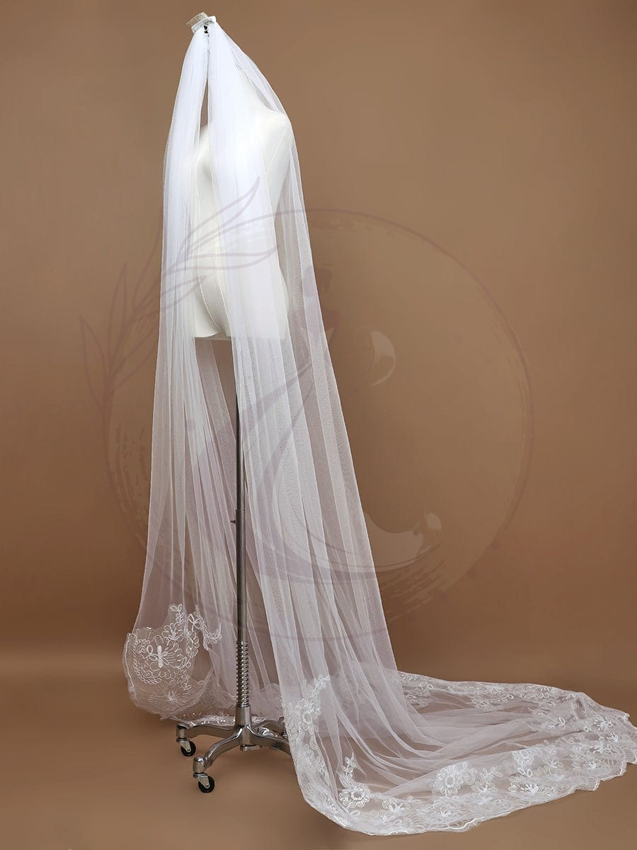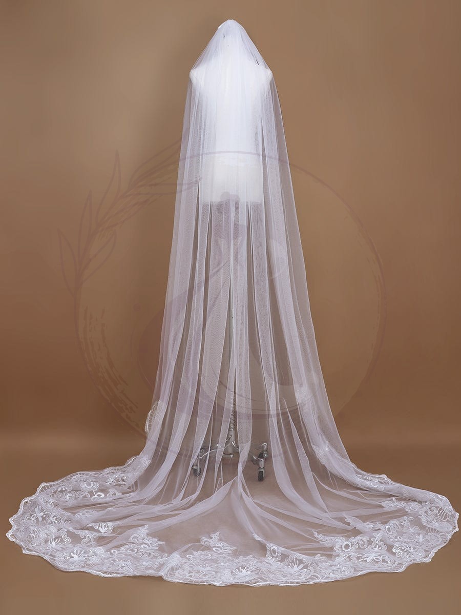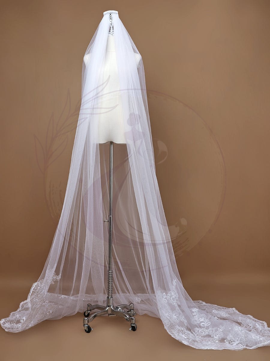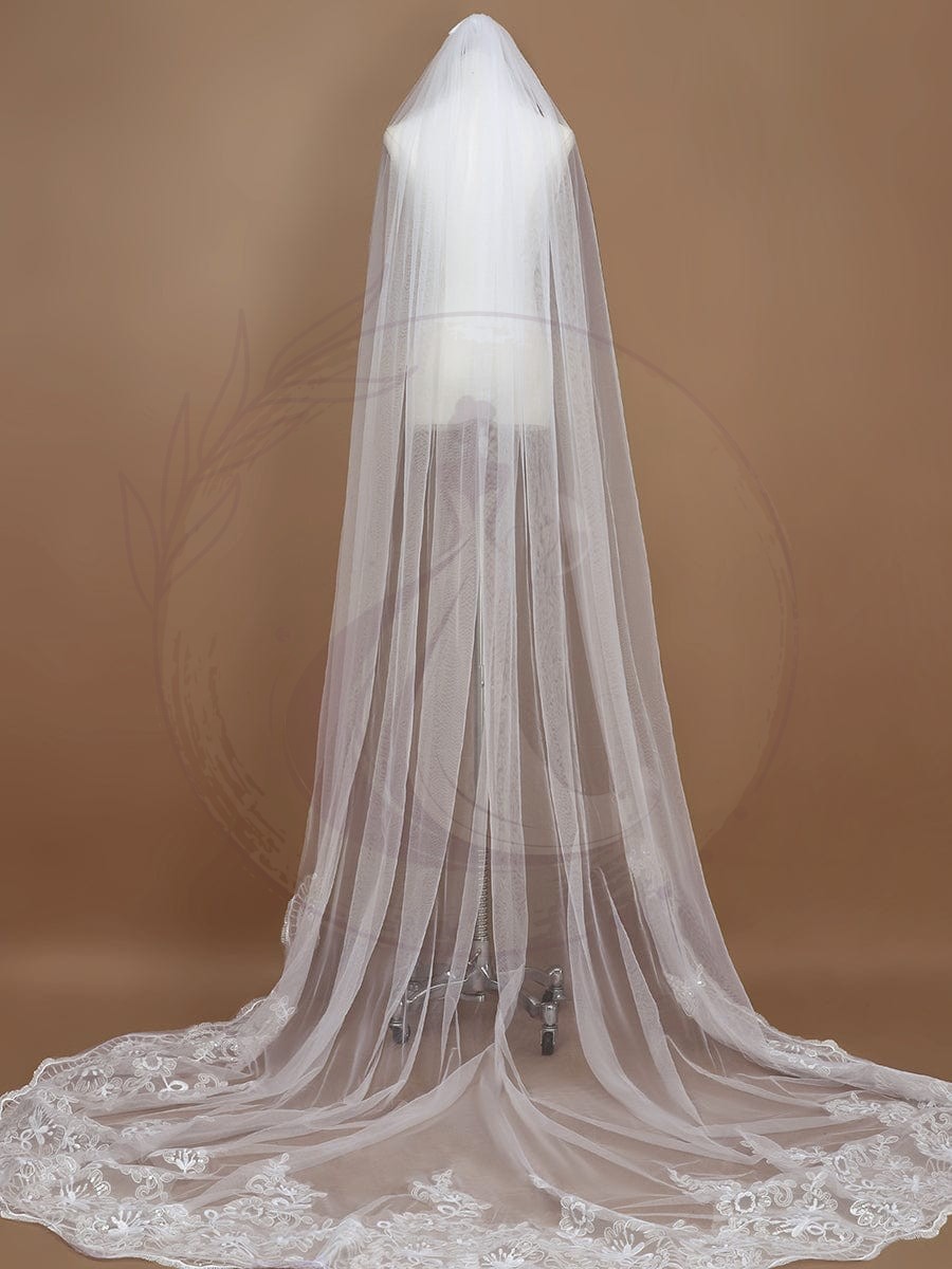 Revêtez cette élégante voile de mariage, ornée de cristal scintillant, et laissez sa longue traîne sublimer votre démarche d’un éclat saisissant. Les fines bordures brodées de délicieux motifs de fleurs confèrent une élégance raffinée à ce voile, parfait pour rehausser votre allure le jour J.