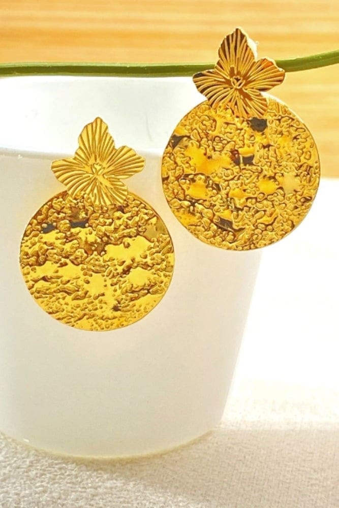 Ces jolies boucles d’oreilles avec un grand disque martelé qui est orné d’une fleur dorée sont parfaites pour illuminer votre visage et mettre en valeur vos cheveux, que ce soit détachés ou attachés.