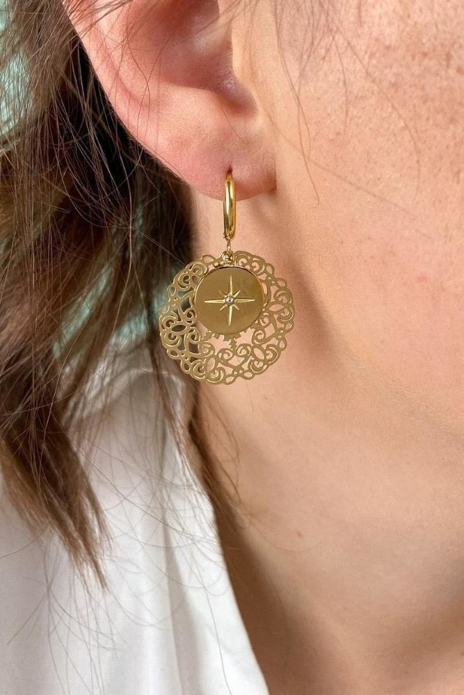 Complétez votre tenue avec ces magnifiques boucles d’oreilles bohèmes. Ces créoles sont ornées de deux pendentifs : une rosette et un strass en forme d’étoile. Fabriquées en acier inoxydable doré, ces pièces ont une grande résistance à l’eau et à l’odeur.