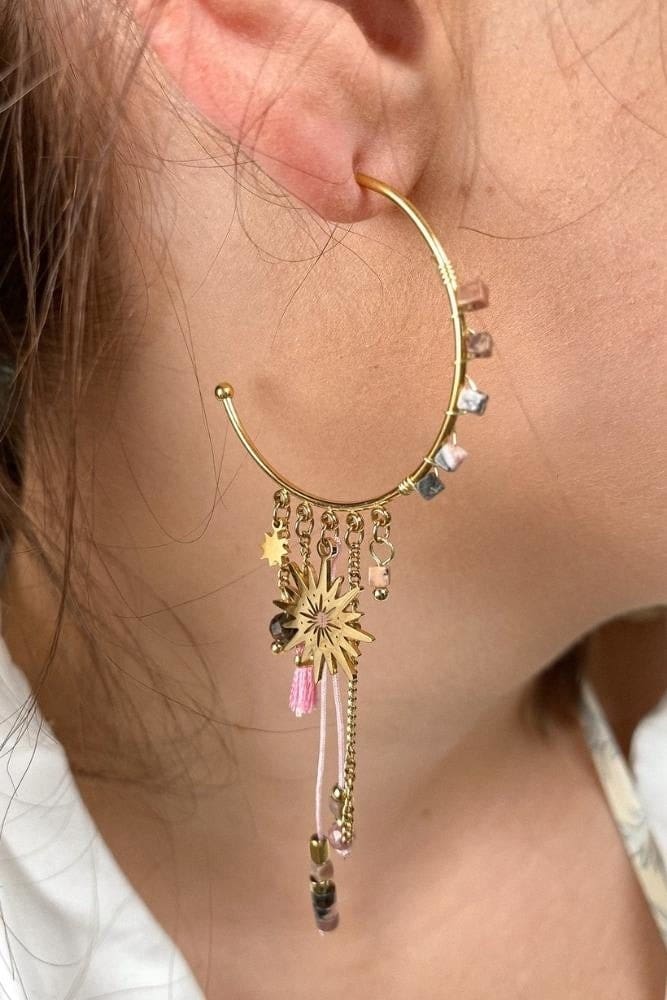 Complétez votre look avec ces magnifiques boucles d’oreilles bohèmes hippies ! De type créole à puce, elles sont ornées de petites pierres naturelles, de perles colorées et d’un pendentif en forme d’étoile. Un accessoire qui exprime la joie et le sentiment de liberté.
