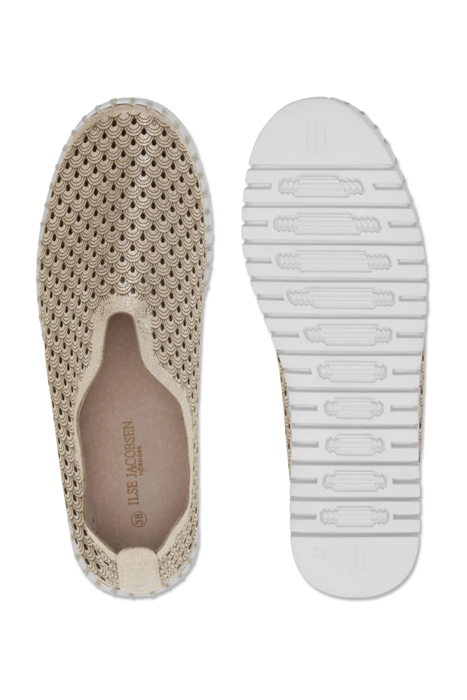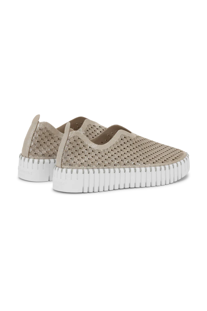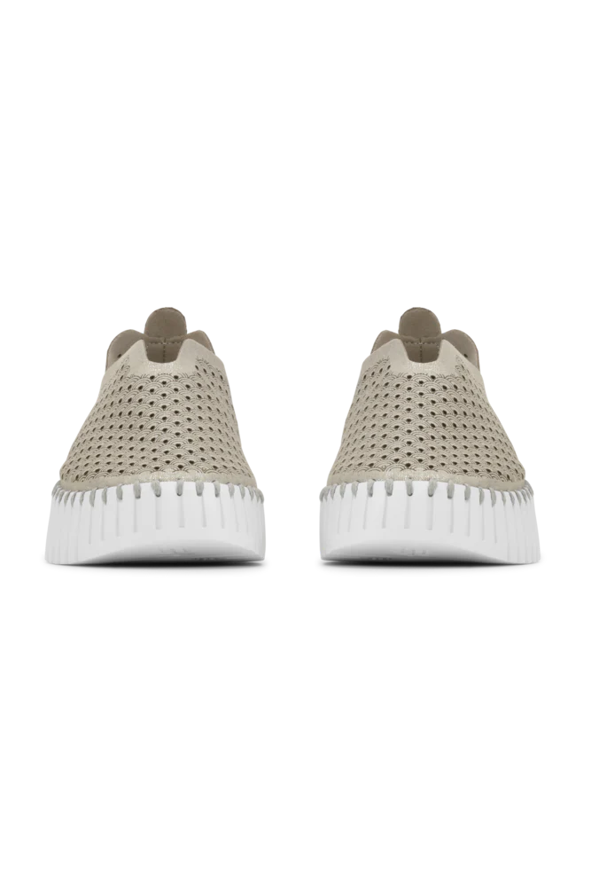 La tige est faite de microfibre recyclée avec un motif décoratif découpé au laser. Elle est fixée à la semelle extérieure à l’aide d’un fil recyclé assorti, sans utilisation de colle.