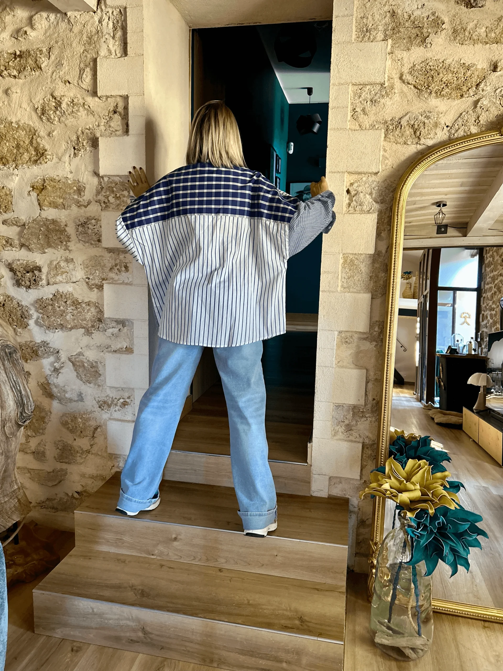 Entre ses rayures graphiques, ses carreaux twistés et sa poche bleue contractante, elle affirme un style urbain et décontracté.