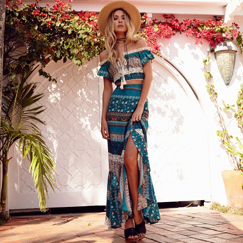 La Hippie robe bohème chic deux pièces verte imprimé floral est un choix élégant et glamour pour un look bohème. Cette robe est conçue avec deux pièces, un haut court et une jupe longue. L’imprimé floral vert est magnifique et ajoute une touche de couleur vive pour un look frais et dynamique. Les manches longues et la longueur de la jupe offrent un style couvrant qui peut être porté en toute occasion.