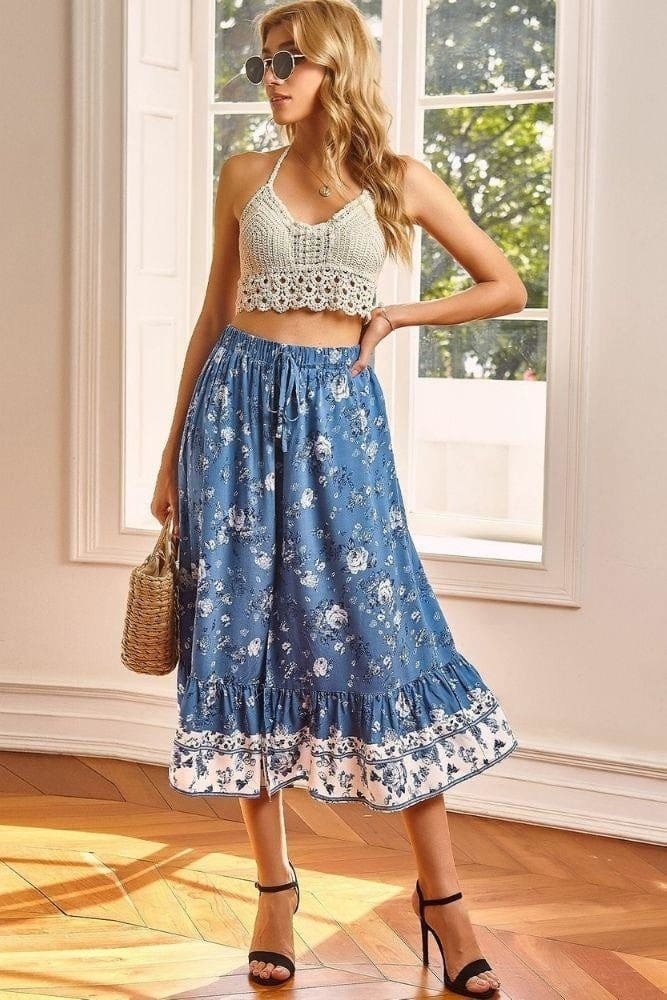 Romantique et trop mignonne, cette jupe midi bohème avec son motif fleuri vous fera danser. Sa fente qui monte à mi-longueur et son ourlet froncé, mettent en valeur les chevilles. Portez-la avec des talons ou des sandales. Une longueur midi très séduisante.
