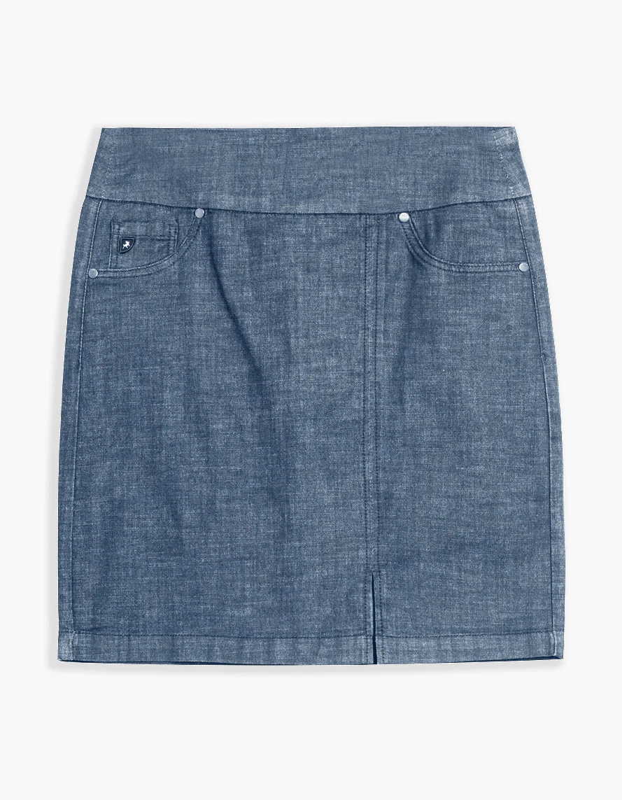 Restez féminine tout en osant bouger librement avec cette jupe-short en denim extensible de la compagnie Lois. Son design ingénieux sans fermeture éclair et à enfilage facile (pull-on) offre un maximum de confort et de simplicité.