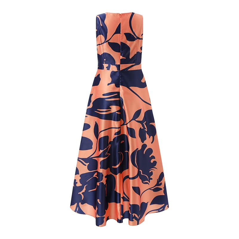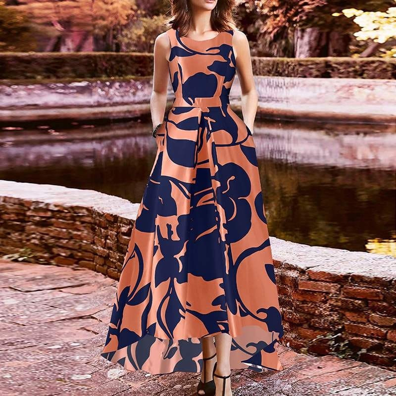Pour ceux qui cherchent un look bohème chic, cette robe asymétrique sans manches orange avec des motifs floraux est une excellente option. Cette robe légère est fabriquée à partir d’un tissu de haute qualité avec un motif floral orange éclatant qui la rend unique et élégante.