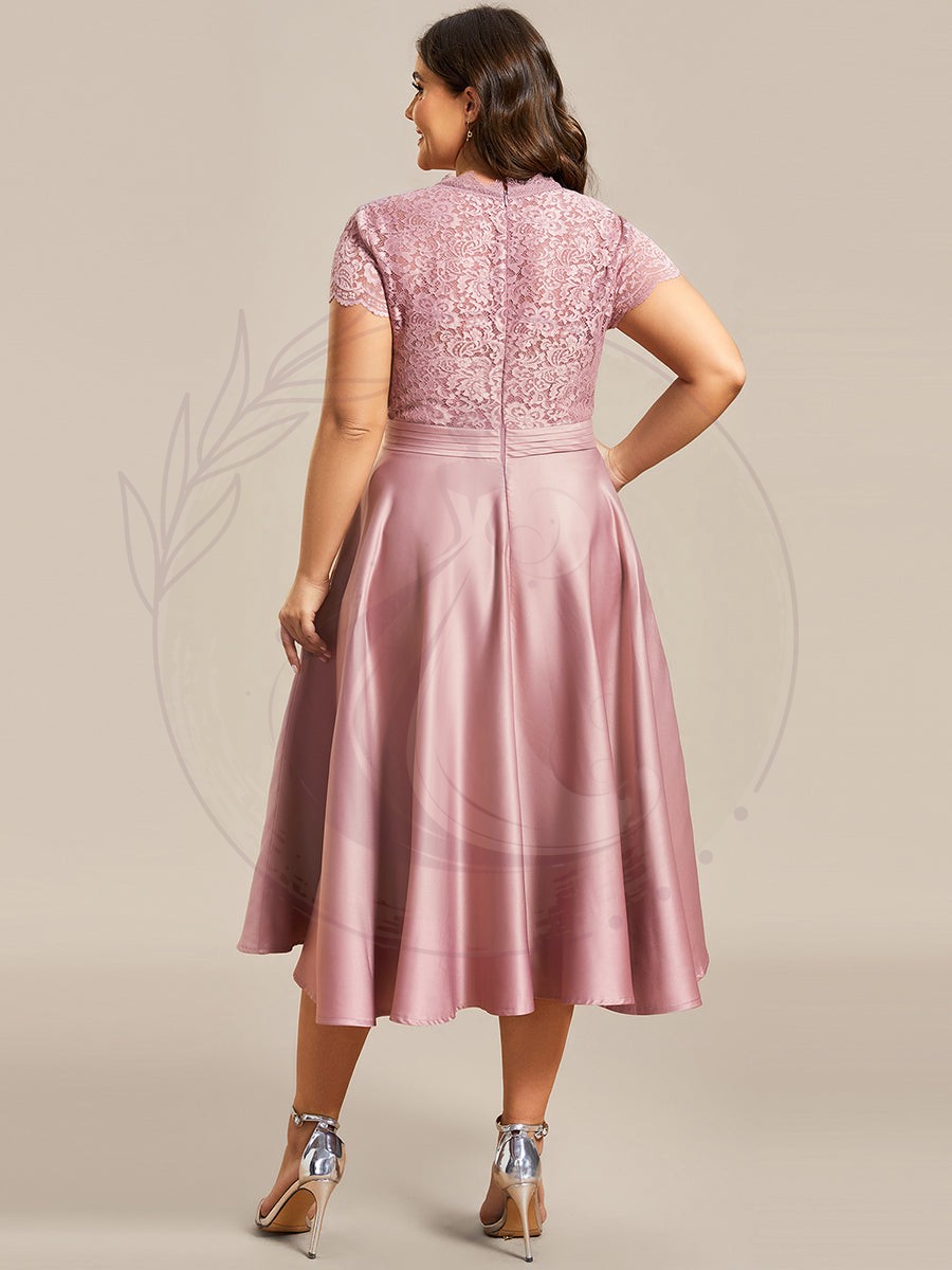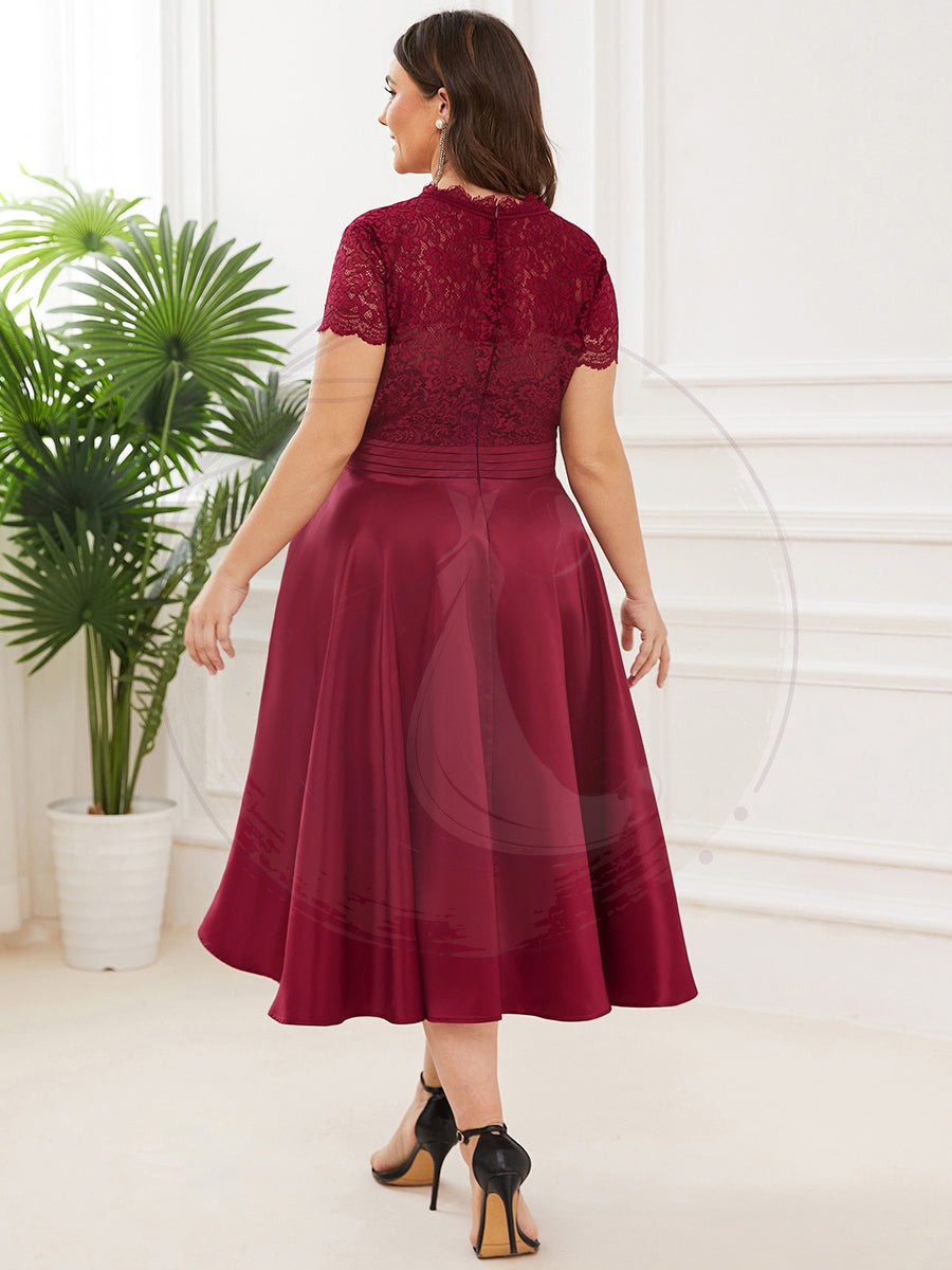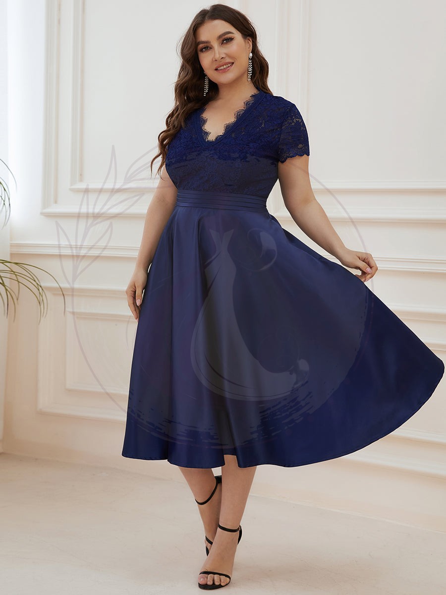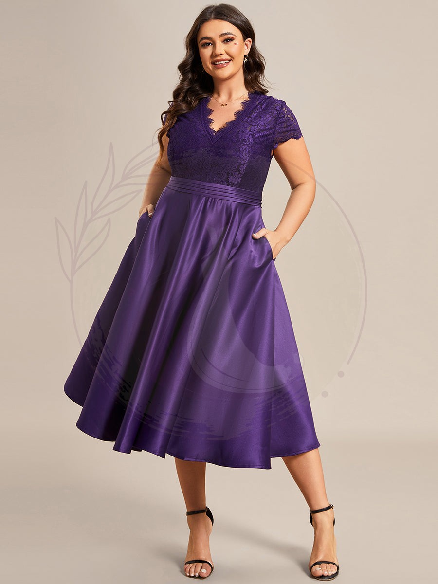 Découvrez le charme intemporel de notre robe cocktail grande taille, une création sublimée par un style rétro distingué. Avec sa délicate dentelle formant de petits mancherons et un décolleté en V agrémenté de jolis œillets, cette tenue incarne la grâce et la finesse. Elle présente une ligne de taille marquée et s’évase en une jupe plissée de longueur midi.