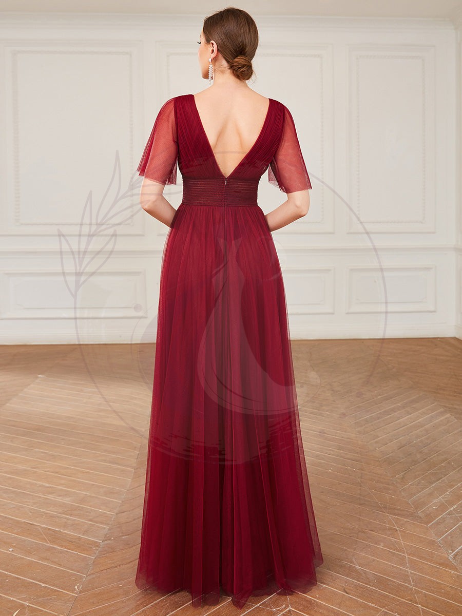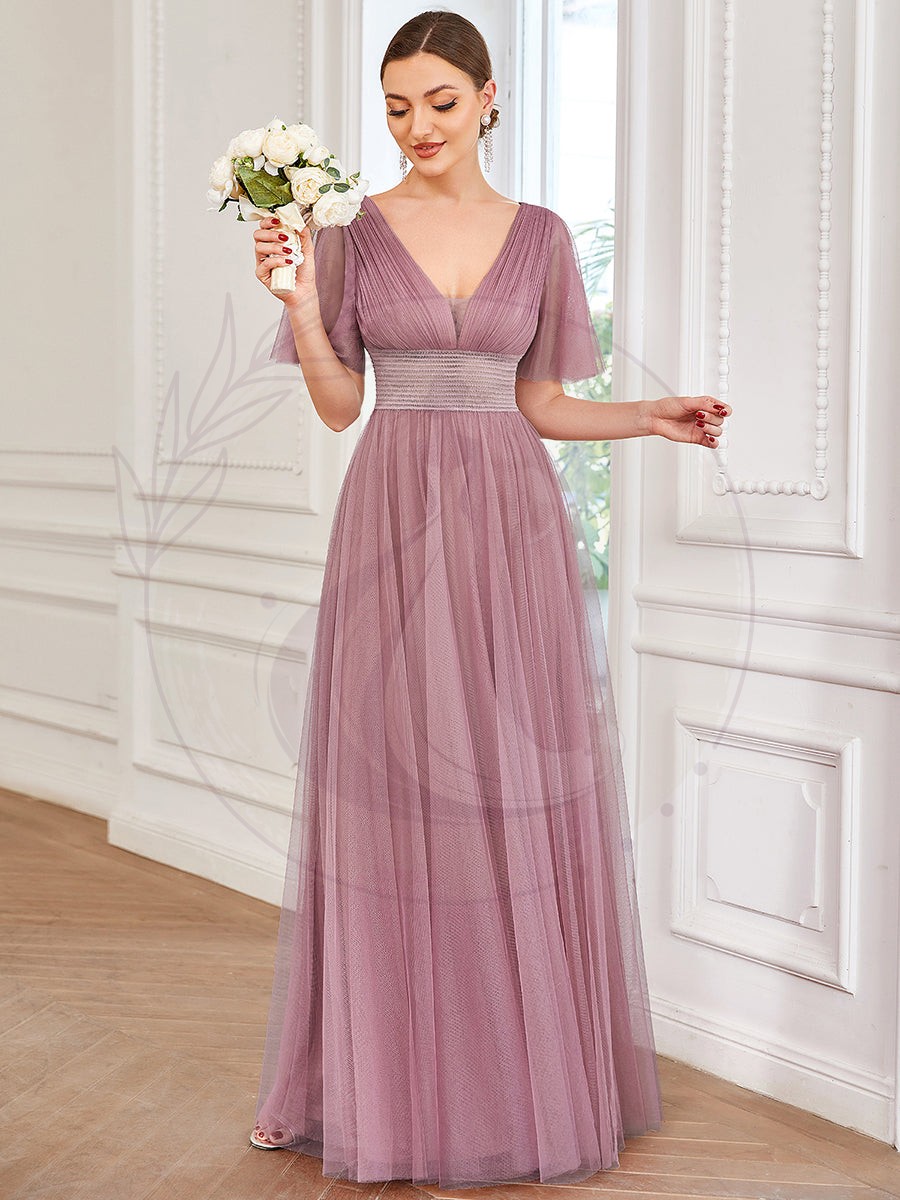 Célébrez le caractère unique de votre union en parant vos demoiselles d’honneur d’une robe élégante et transparente conçue pour l’occasion. Dotée de manches courtes, cette tenue sculpte la silhouette avec sa taille marquée et son décolleté en V profond, tout en offrant l’élégance d’un dos ouvert. Une jupe fluide en tulle descendant majestueusement jusqu’au sol vient parfaire une allure féerique adaptée à une multitude de morphologies.