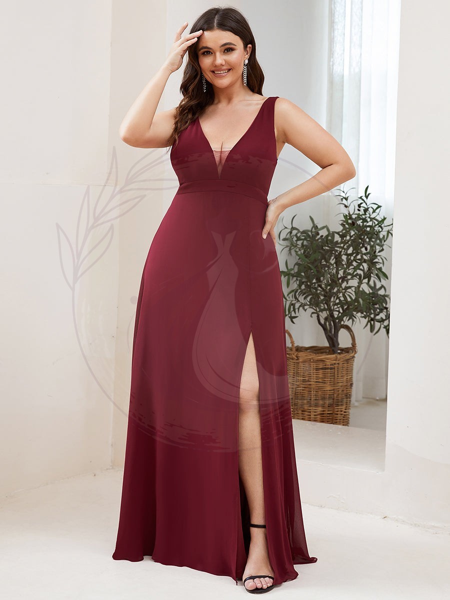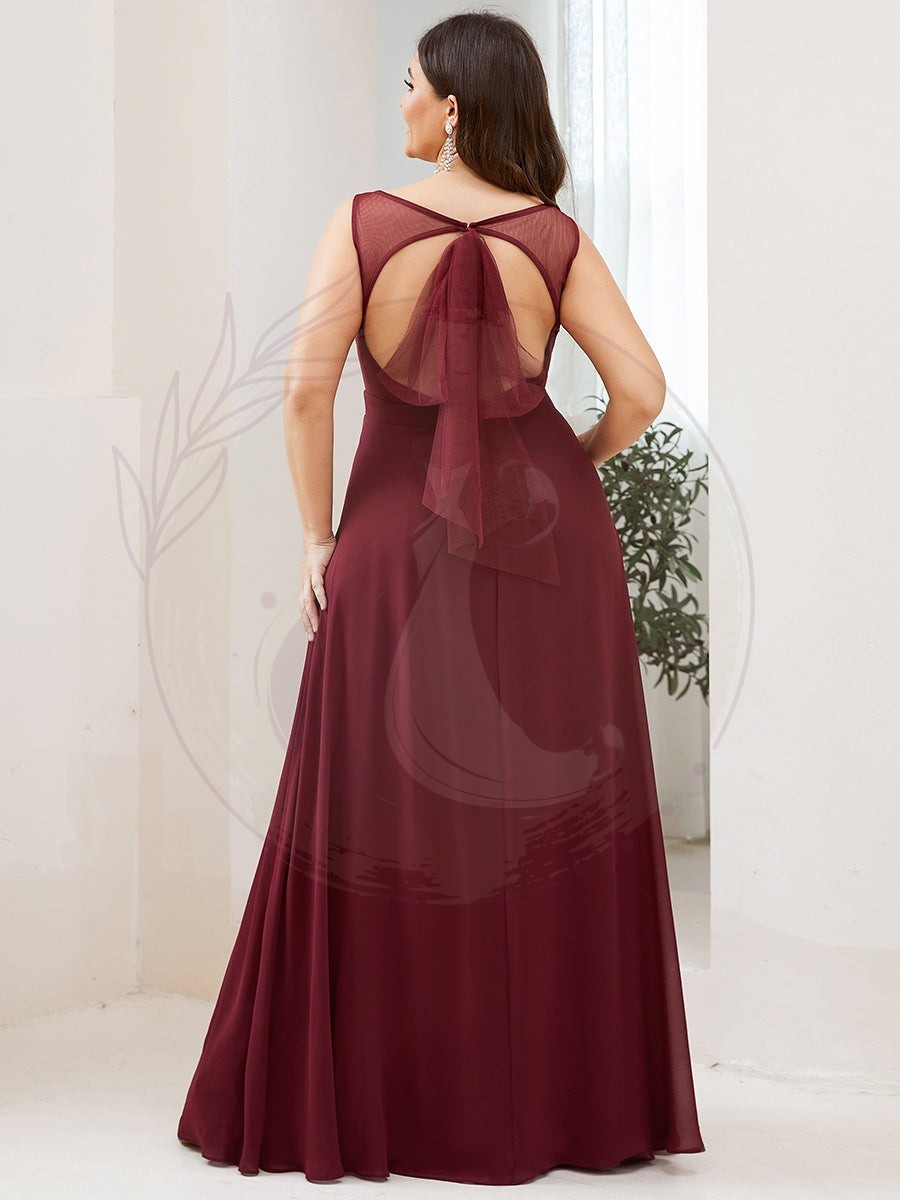 Cette magnifique robe destinée aux demoiselles d’honneur se distingue par ses éléments raffinés et féminins. Elle présente un décolleté en V saisissant mis en valeur par une pièce transparente centrale, un dos nu agrémenté de liens translucides et fluides, sans oublier une jupe évasée sophistiquée rehaussée d’une élégante fente latérale haute.