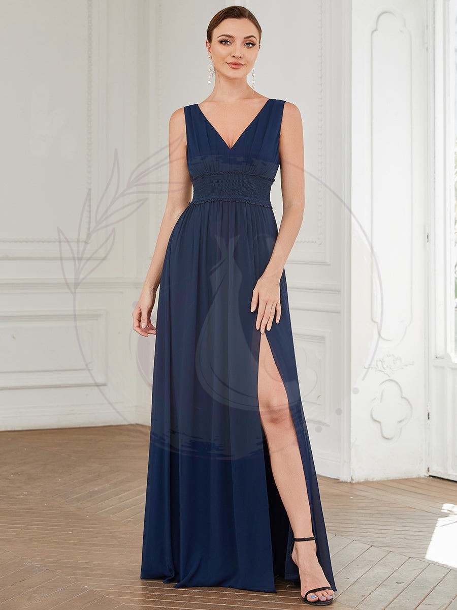 Optez pour cette élégante robe de demoiselle d’honneur à traîne pour apporter une touche d’originalité à vos occasions exceptionnelles. Dotée d’une audacieuse fente avant et d’une silhouette valorisante grâce à sa ceinture, elle saura vous mettre en valeur. Son décolleté en V vertigineux est muni d’un détail illusion, et son dos en V s’associe harmonieusement aux manches courtes volumineuses, idéal pour un repas de gala, tenir le rôle de demoiselle d’honneur ou pour une célébration nuptiale.