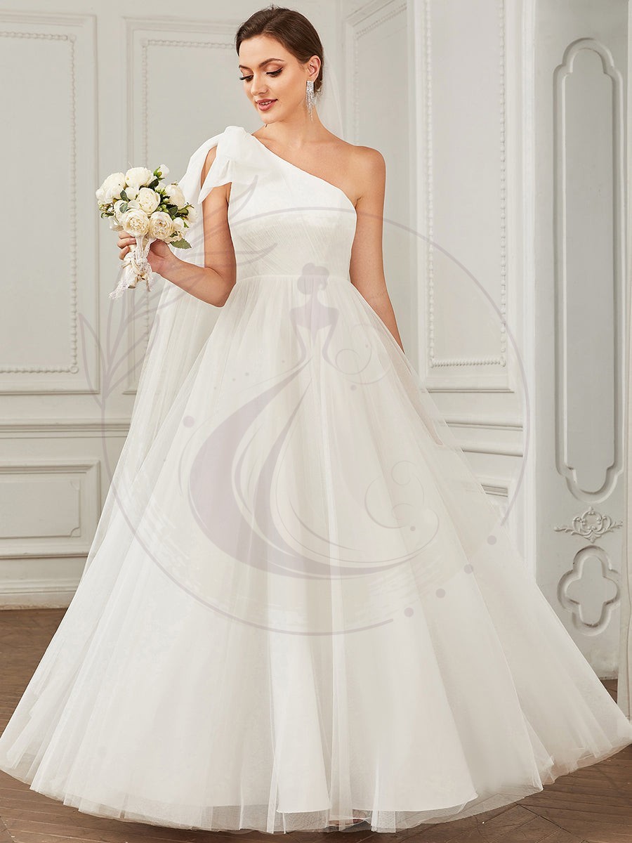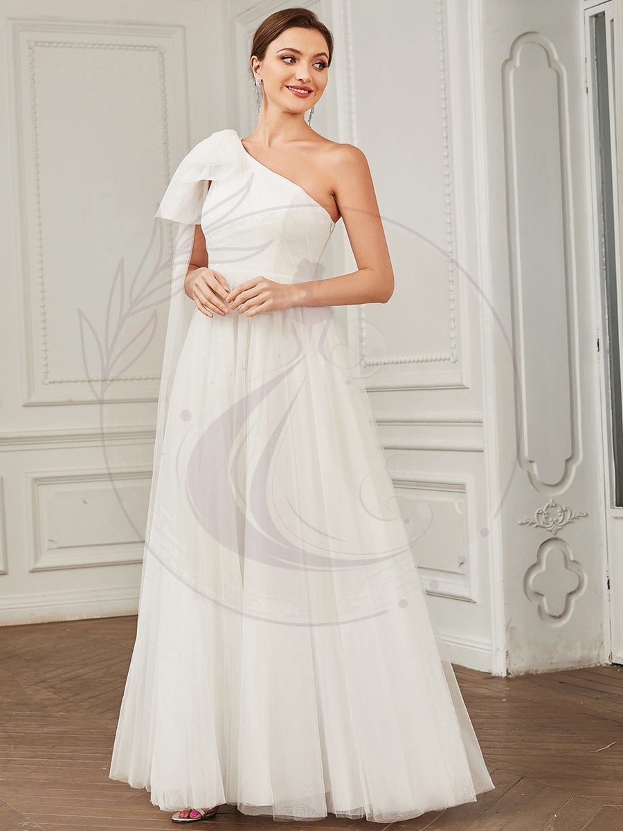 Sublimez votre allure le jour J avec cette magnifique robe de mariée, véritable hymne à la grâce. Elle est caractérisée par une épaule dénudée rehaussée d’un voile aérien qui retombe le long du bras, apportant une touche de distinction. La partie supérieure sans manches est travaillée avec des pinces structurées, aboutissant à une taille marquée avant de s’évaser en un tulle léger superposé pour créer une silhouette romantique et flottante.