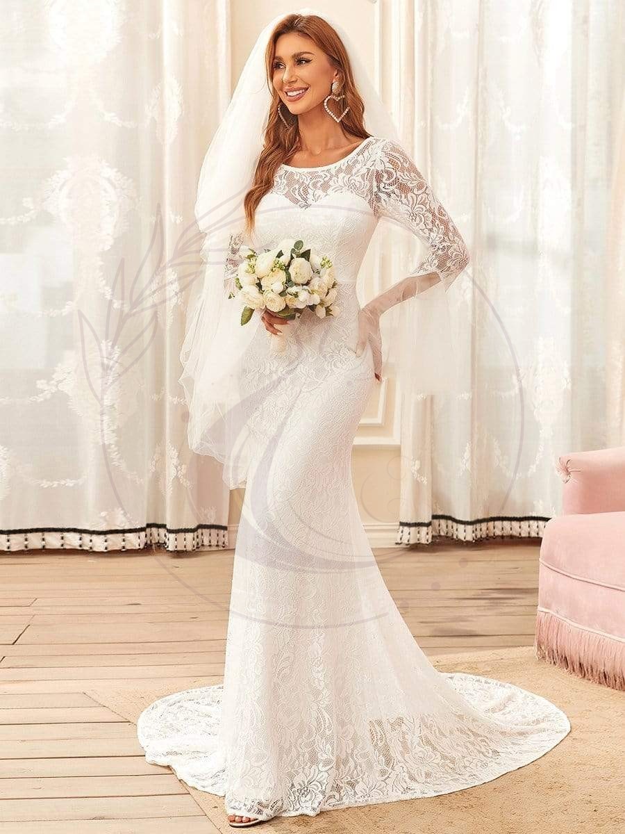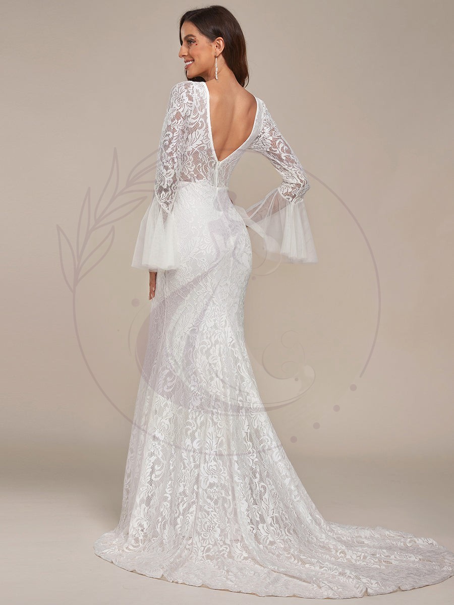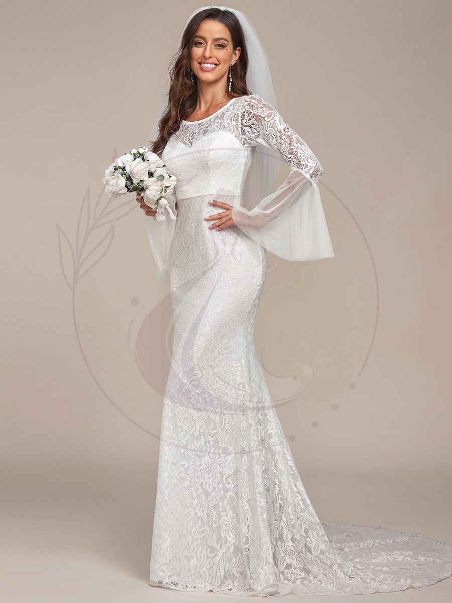 Devenez l’incarnation du raffinement avec notre prestigieuse robe de mariée, parfaite pour votre grand jour. Sa confection en dentelle ornée de motifs floraux se mêle à des manches longues agrémentées de poignets cloche en transparence et un dos échancré. Son design bien pensé dessine votre silhouette tout en débouchant sur une jupe évasée majestueuse, la quintessence même de la grâce. Cette tenue nuptiale est conçue pour sublimer chaque future mariée.