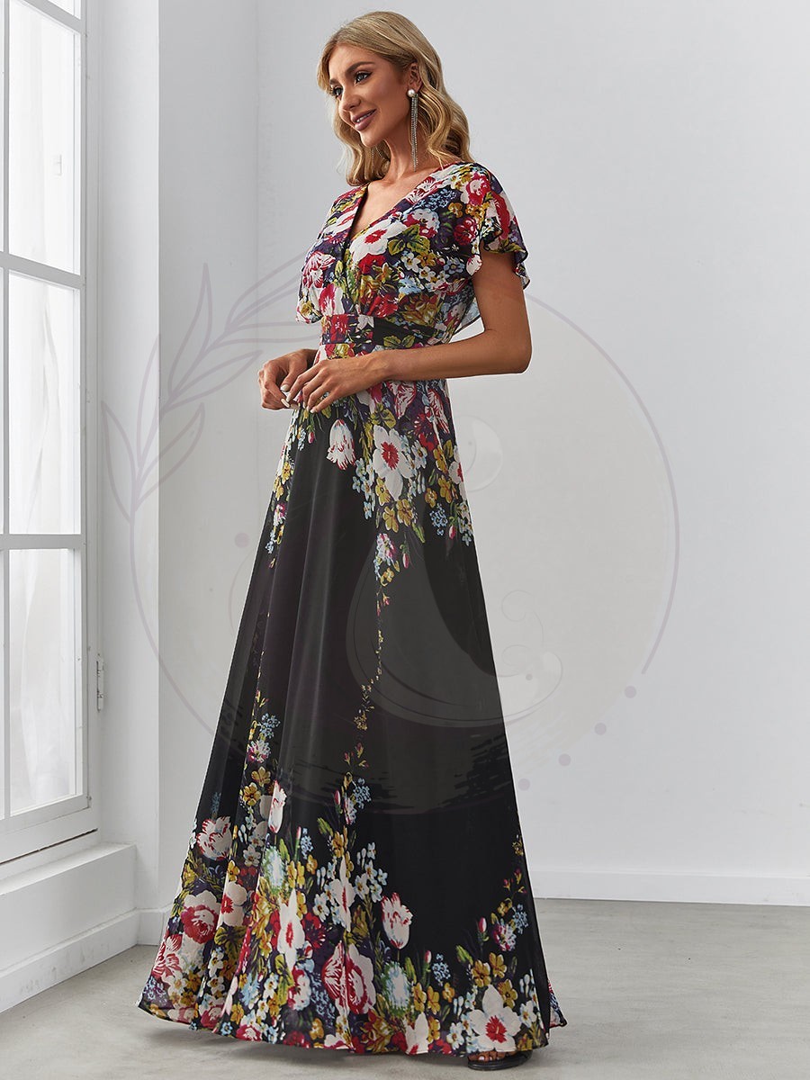 Faites de votre prochaine célébration ou de vos futures congés une occasion inoubliable avec cette élégante robe de soirée fluide et évasée en mousseline. Avec son allure élégante caractérisée par des manches courtes aériennes, un décolleté en V plongeant, une taille marquée et une jupe longue ondulant jusqu’au sol, cette tenue imprimée s’adapte aisément à divers événements tels qu’un mariage, une réception somptueuse, une soirée d’excellence, et plus si affinités.