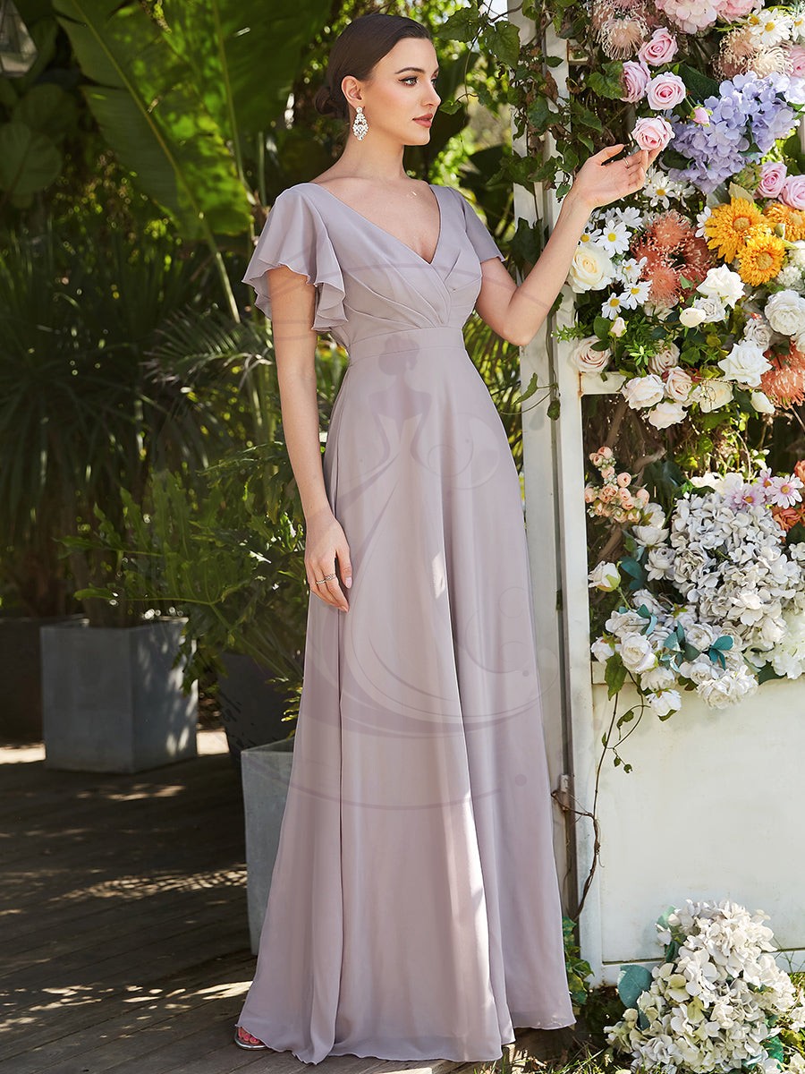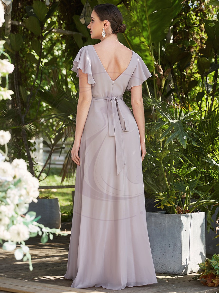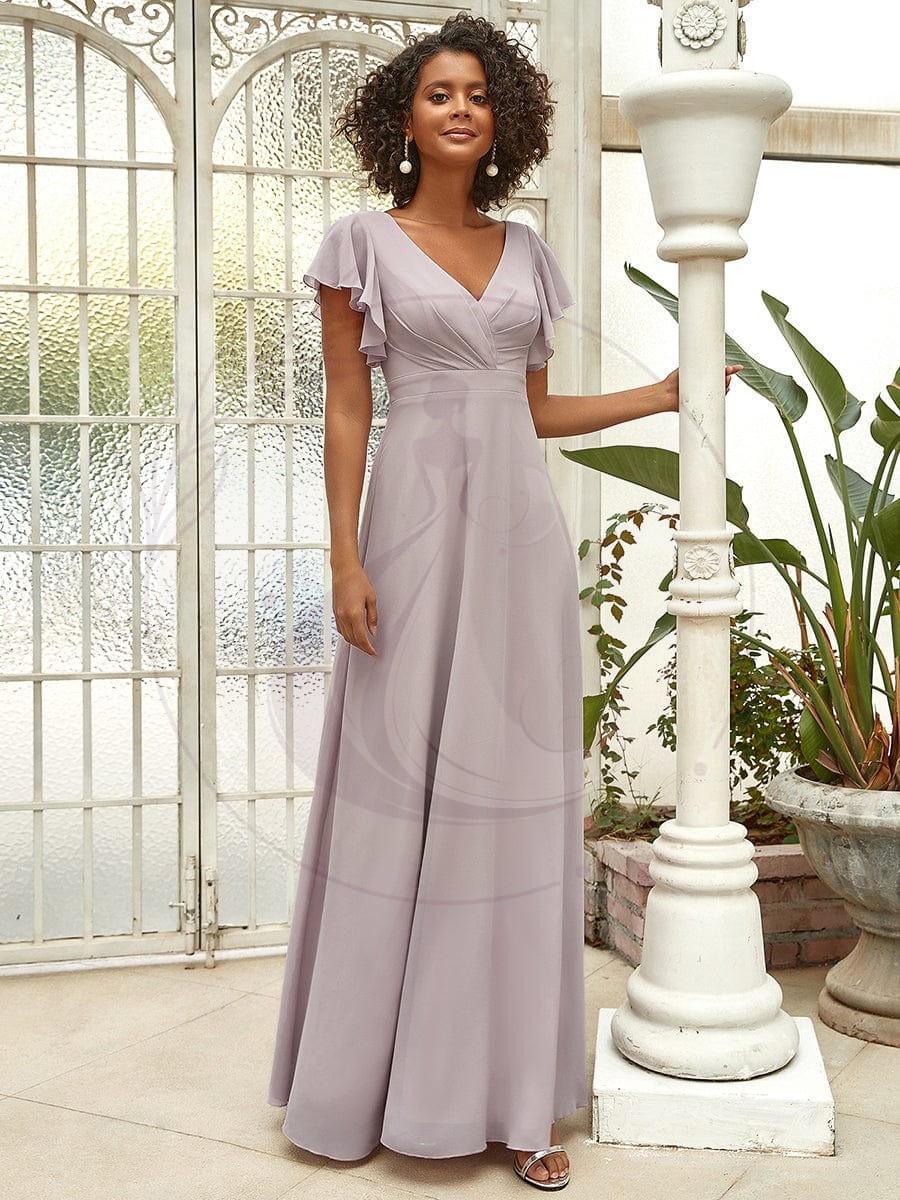 Adoptez une allure gracieuse et raffinée avec notre somptueuse robe de gala. Elle est soigneusement taillée avec des manches évasées, un décolleté en V et des plis délicats ornant le buste. La silhouette est cintrée par une élégante ceinture à lacer au dos, pour finir sur une jupe évasée qui déploie sa grâce jusqu’à frôler le sol.