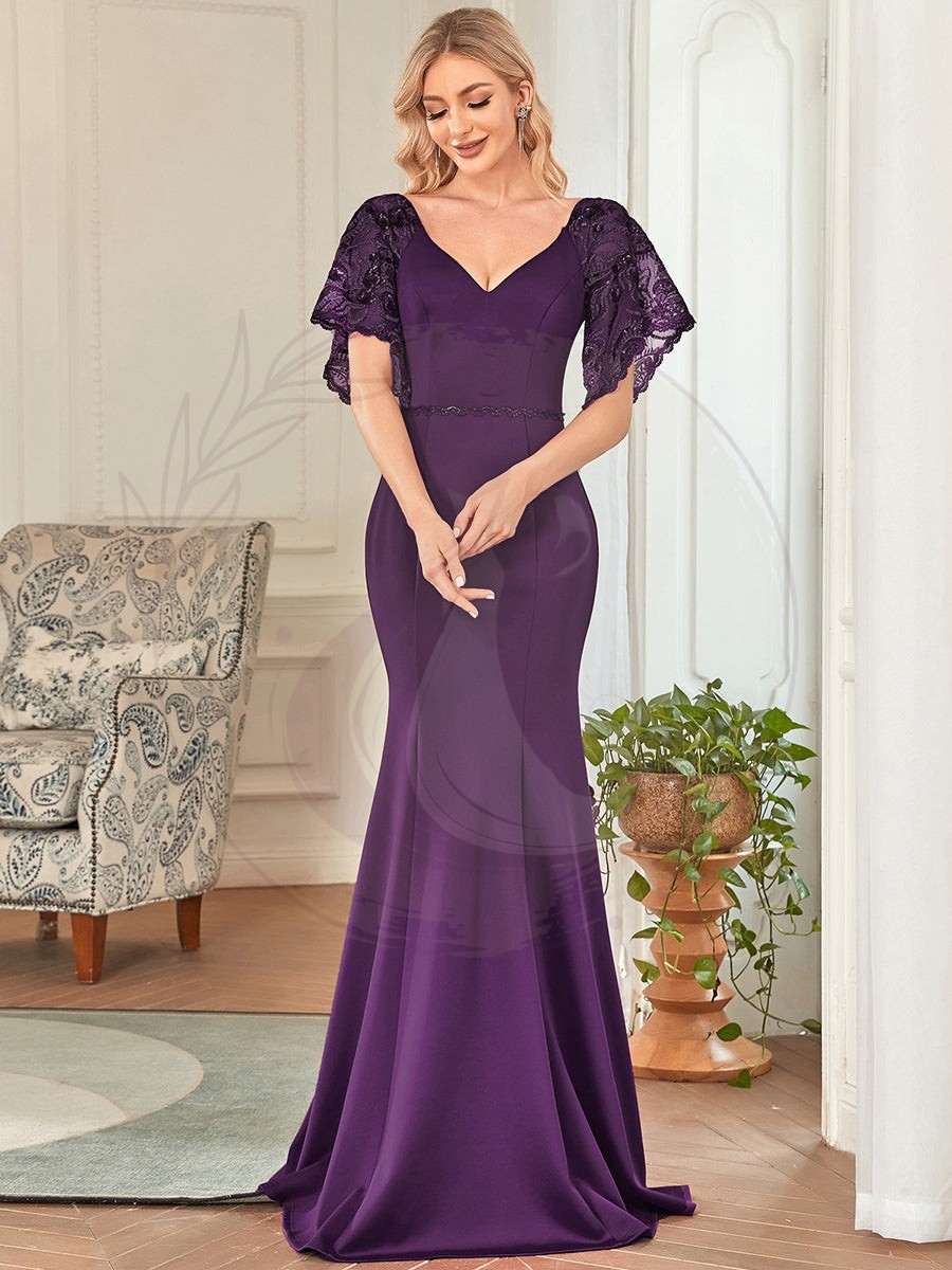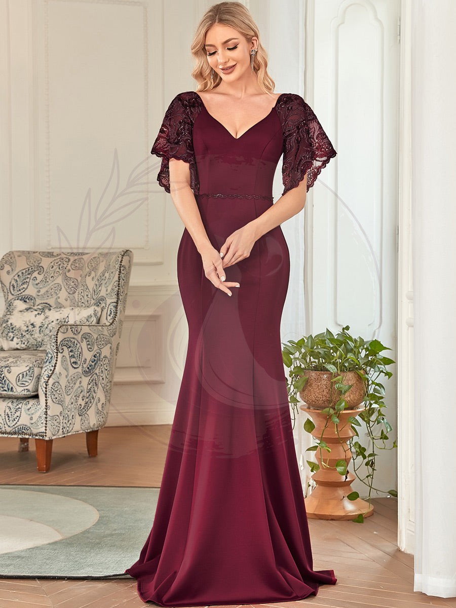 Laissez-vous séduire par cette magnifique tenue de soirée à la fois sensuelle et distinguée qui vous conférera une allure raffinée tout en boostant votre assurance. Distinguée par son décolleté en V audacieux et ses manchettes légèrement évasées ornées de sequins étincelants, cette robe est l’alliée idéale pour les grands événements tels que cérémonies nuptiales, soirées cocktail, bals de finissants, gala de prestige, baptêmes, rentrées solennelles, célébrations de remise de diplôme ou tout autre événement formel.