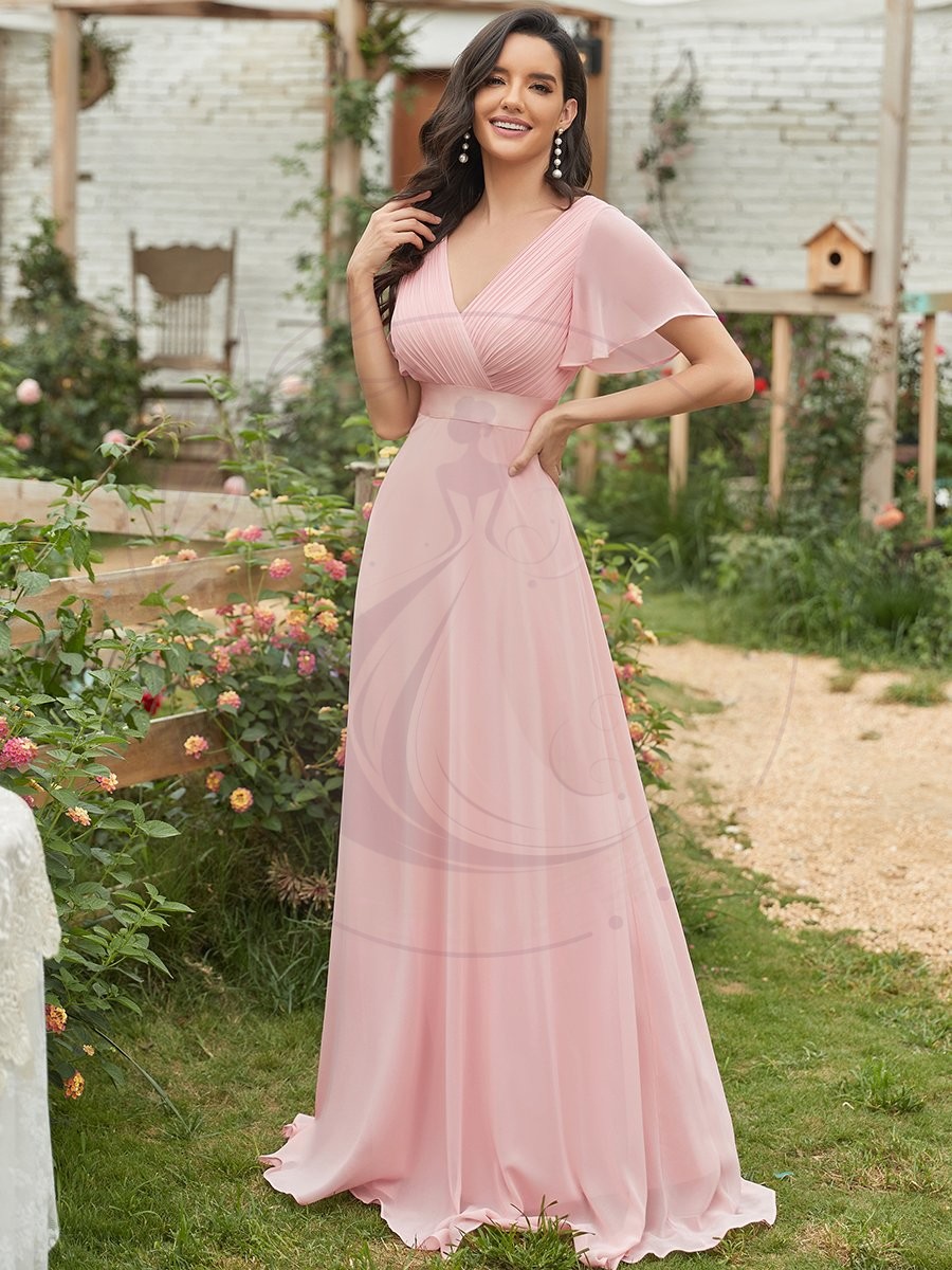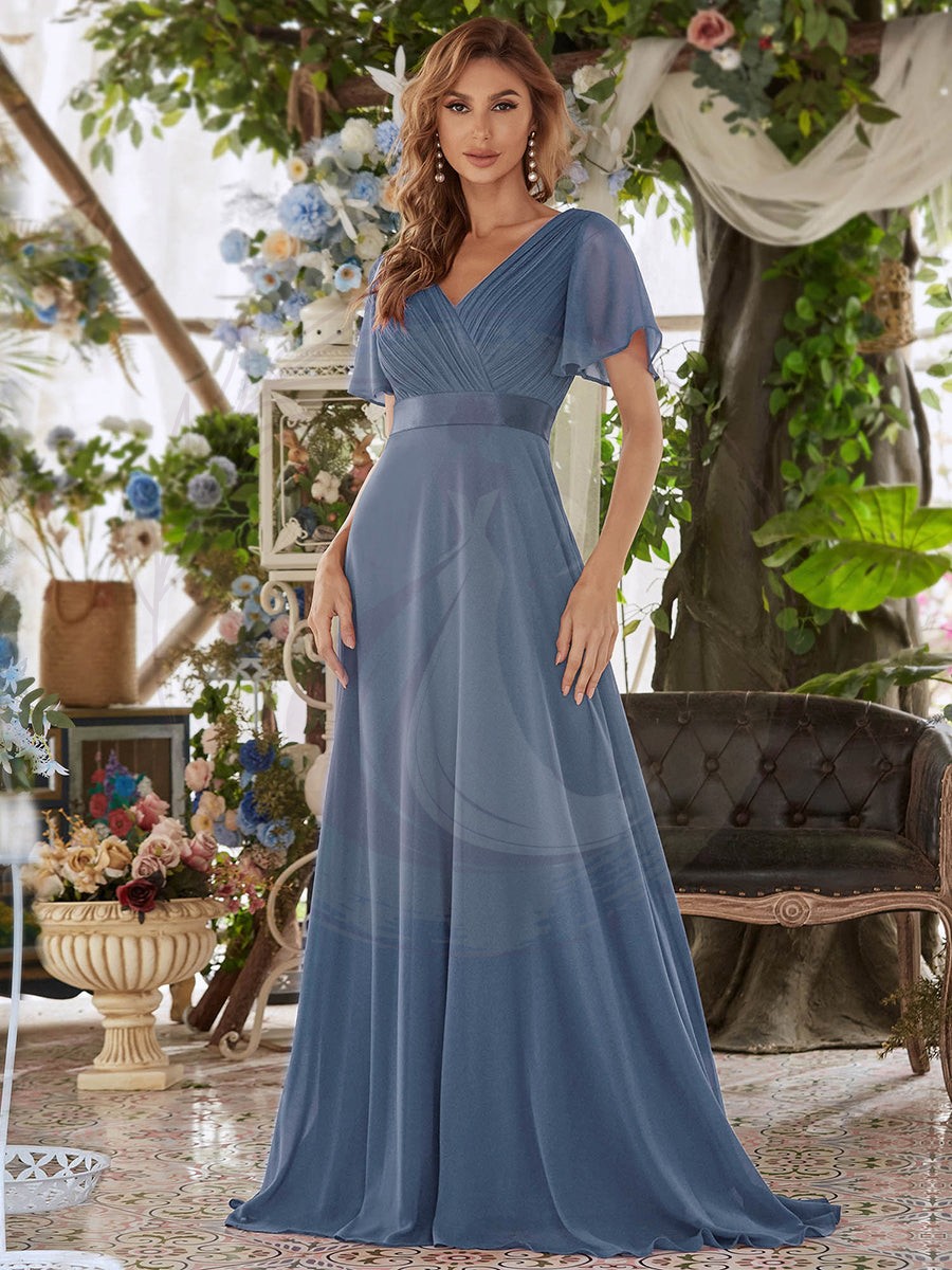 Découvrez cette élégante robe de soirée pour demoiselle d’honneur caractérisée par un raffiné décolleté en V, une ceinture qui souligne la taille, de charmantes manches courte type papillon et un ourlet délicat. Idéale pour un mariage, un gala, un bal de fin d’année, ou toute cérémonie d’envergure.
