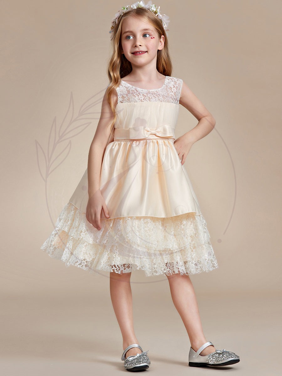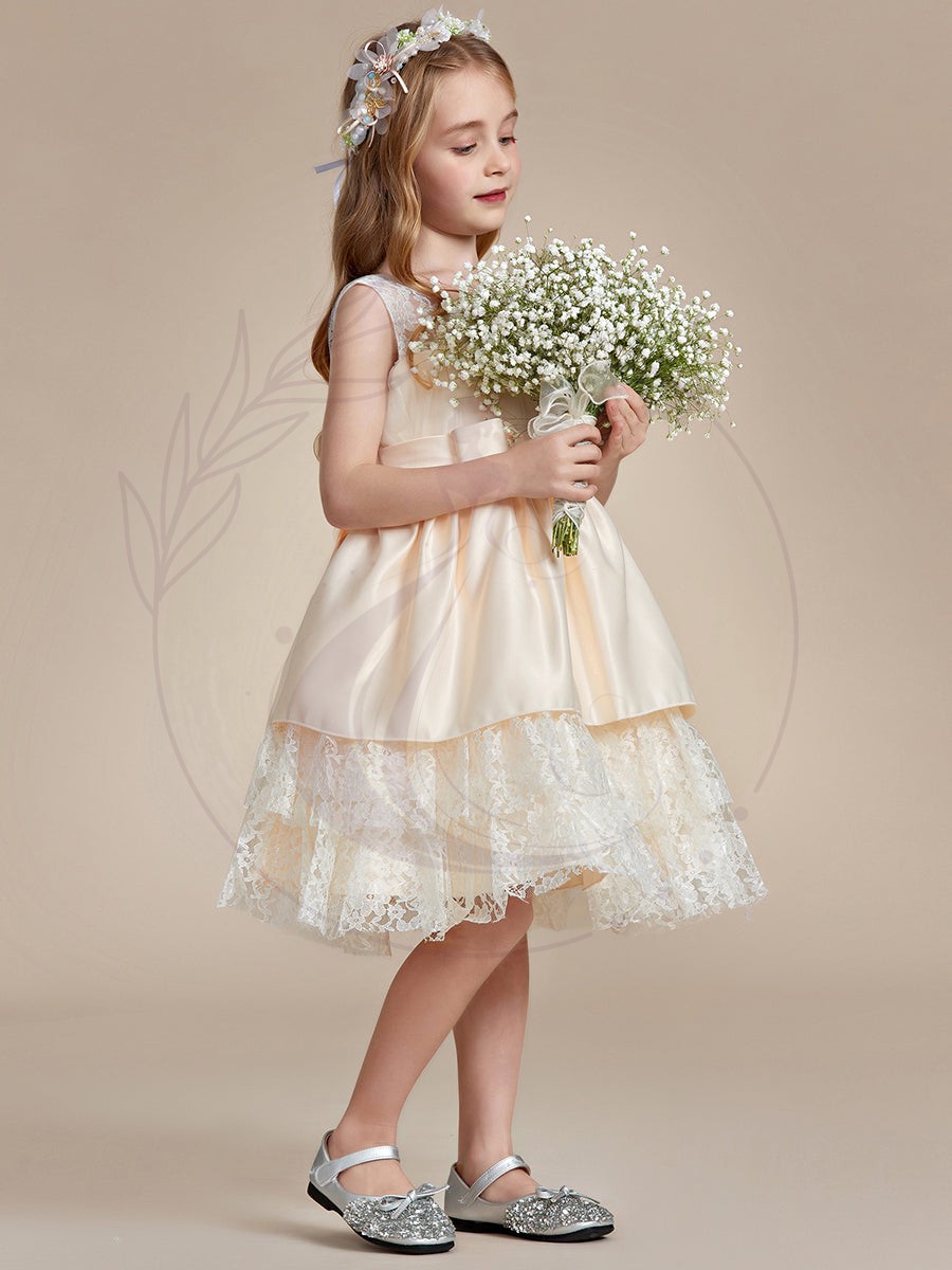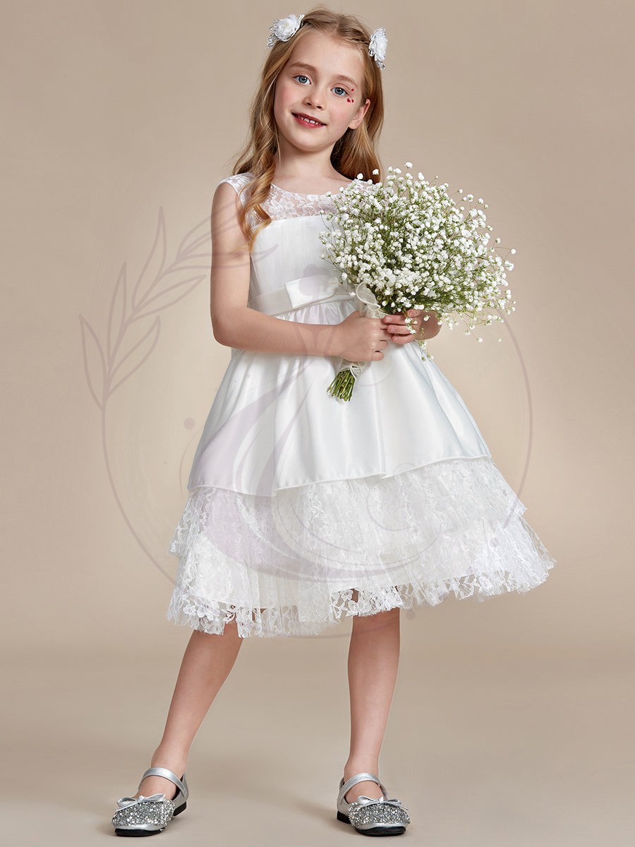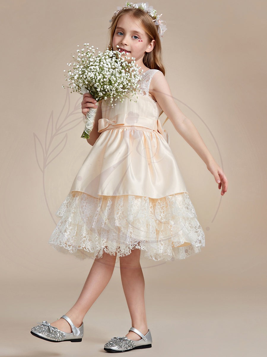 Incarnant la douceur à l’état pur, cette robe charme par ses superpositions de dentelle raffinée évoquant une pâtisserie fine. L’ajout d’un nœud oversize à l’arrière confère une note espiègle et une élégance ludique. Conçue pour magnifier chaque événement d’importance, tel que les cérémonies de mariage ou les célébrations festives, cette tenue se révèle être une option sophistiquée pour habiller votre jeune demoiselle.