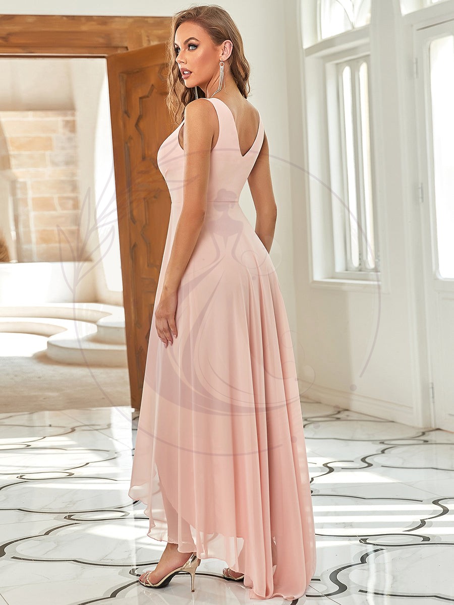 Conçue pour mettre en valeur votre élégance, cette sublime robe de bal présente un décolleté en V plongeant avec une conception asymétrique avant-arrière qui vous octroie la liberté de vous déplacer et de danser sans risquer de piétiner votre robe.
