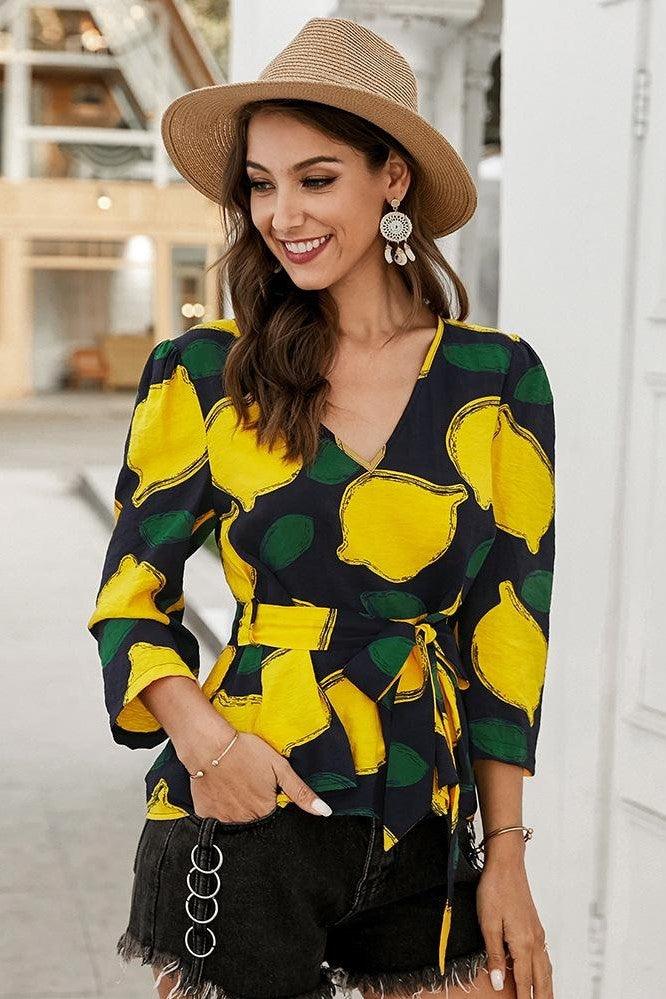 Ce haut bohème à manches longues se décline en ton clair ou foncé. Son motif citron apporte une touche d’originalité. Son tissu est très fin et ses manches longues habilleront votre silhouette. Le col V mettra en valeur votre poitrine et la ceinture à nouer soulignera votre taille. Une pièce pleine de fraîcheur.